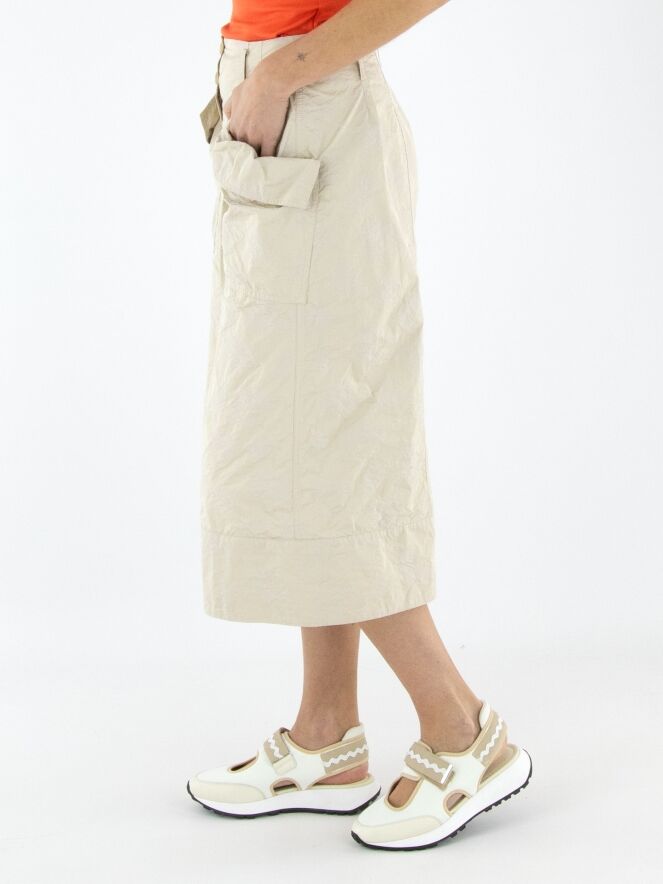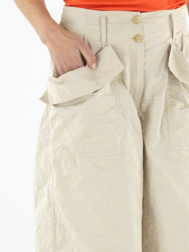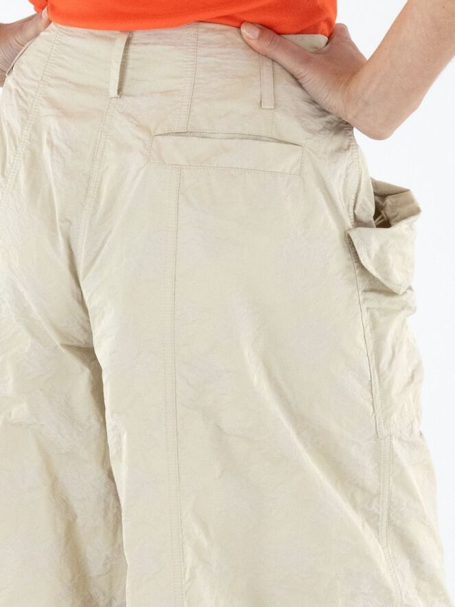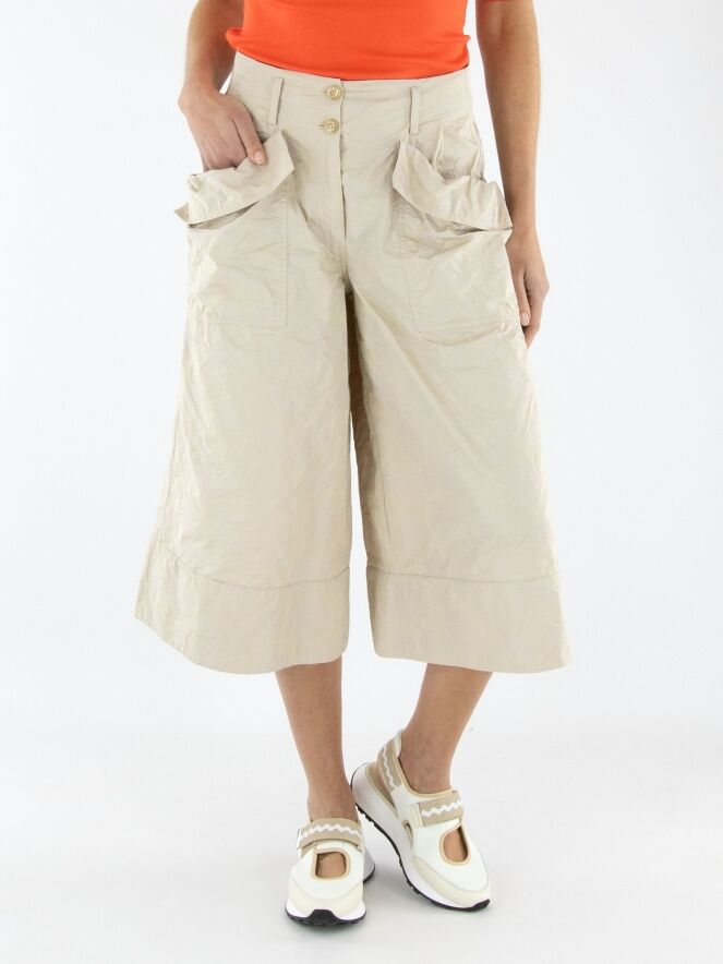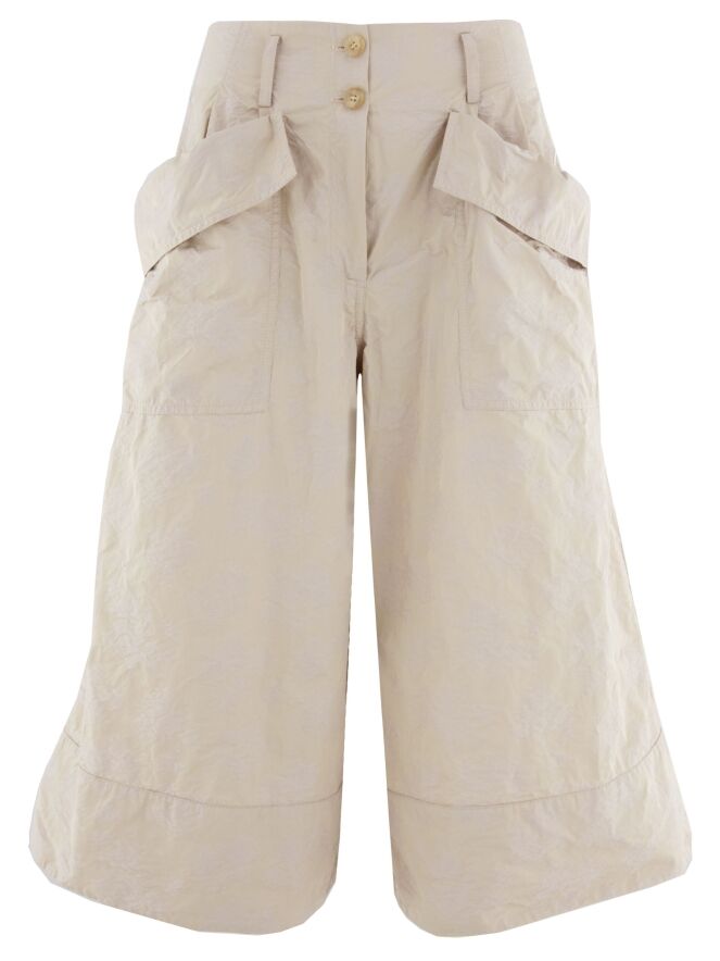 Een bermuda van Annette Görtz in een jacquardprint met de kleuren zand en beige. In de rand van de diagonale, brede omslag van de zakken bevindt zich een koord in een tunnelverwerking, waarmee een plooi-effect kan worden gecreëerd. Deze bermuda kan op 30 graden worden gewassen.
