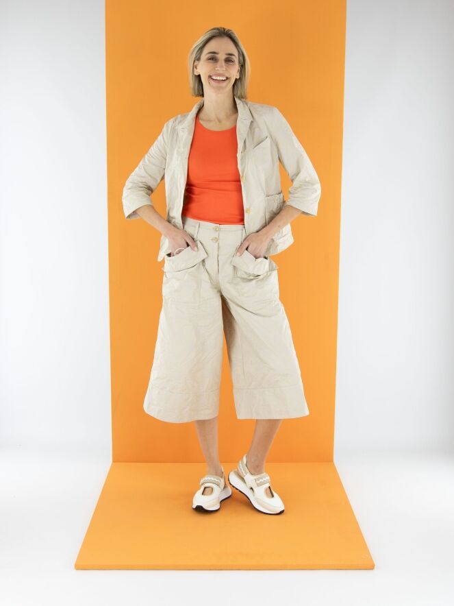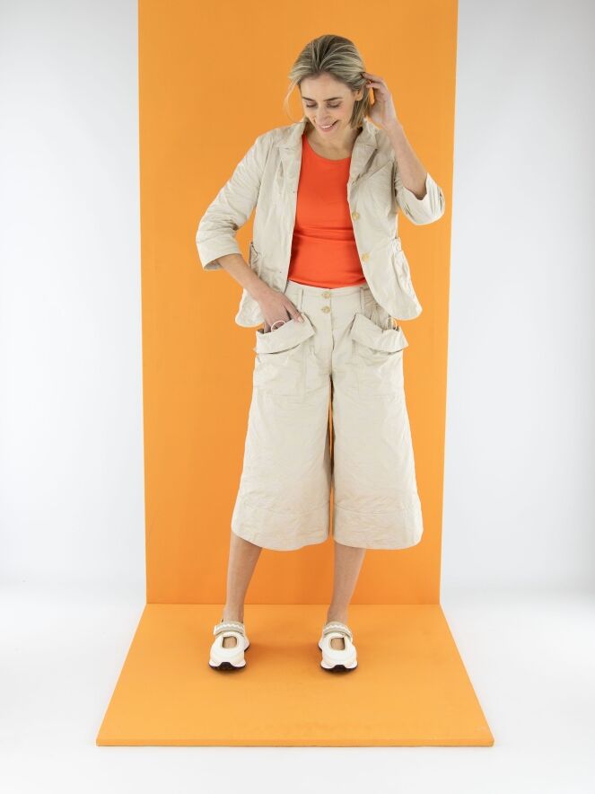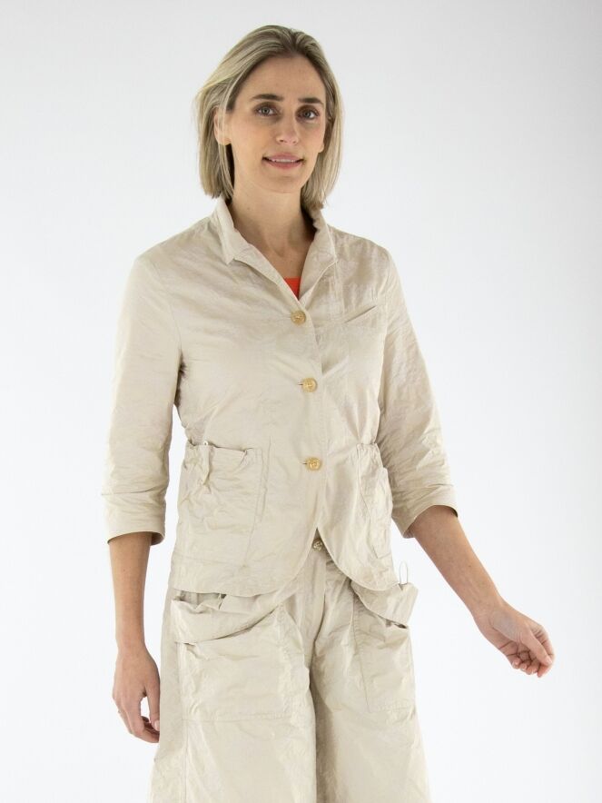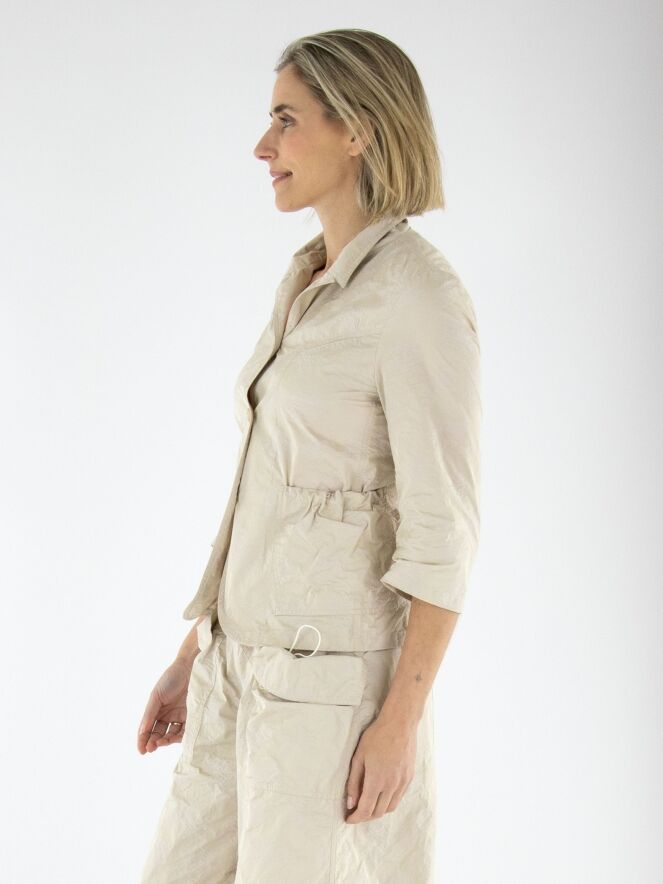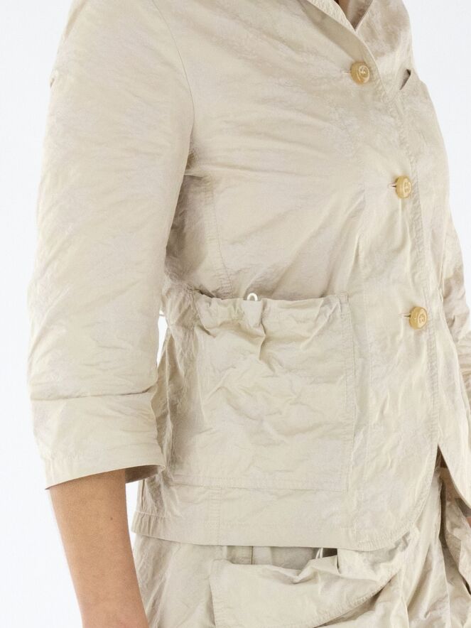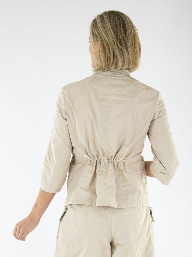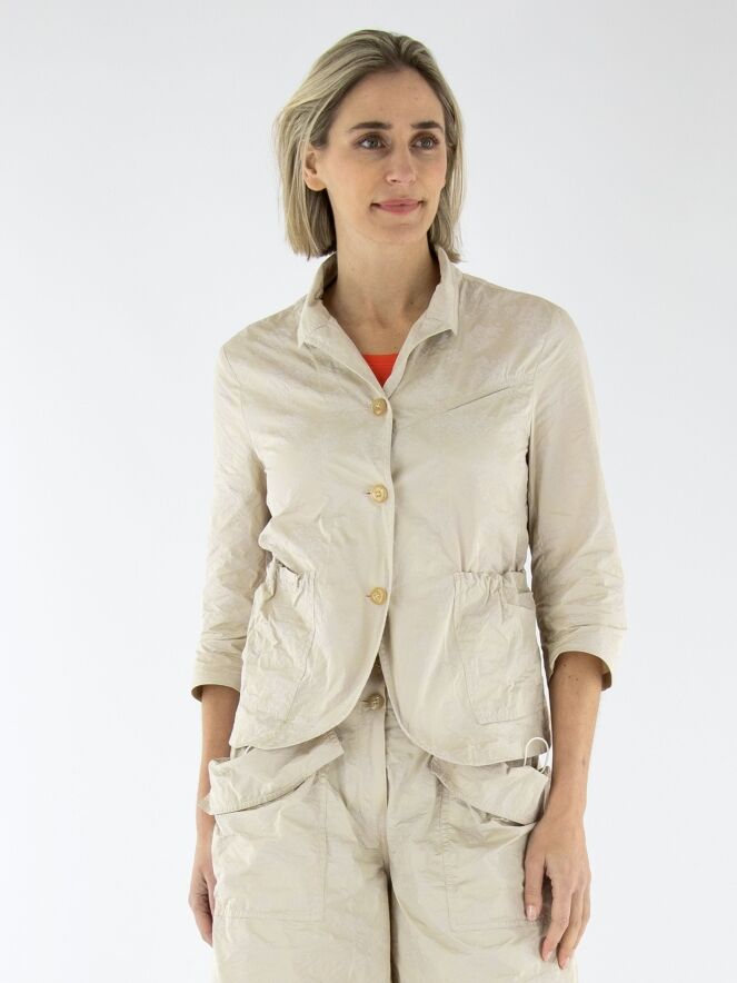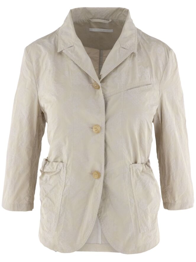 Een blazer van Annette Görtz in een jacquardprint met de kleuren zand en beige. De blazer heeft halflange mouwen en een sluiting met drie knopen. Aan de achterkant bevindt zich ter hoogte van de taille een koord in een tunnelverwerking, waarmee een plooi-effect gecreëerd kan worden. Dit decoratieve detail komt terug in de randen van de zakken aan de voorzijde. De blazer is ongevoerd en kan op 30 graden worden gewassen.