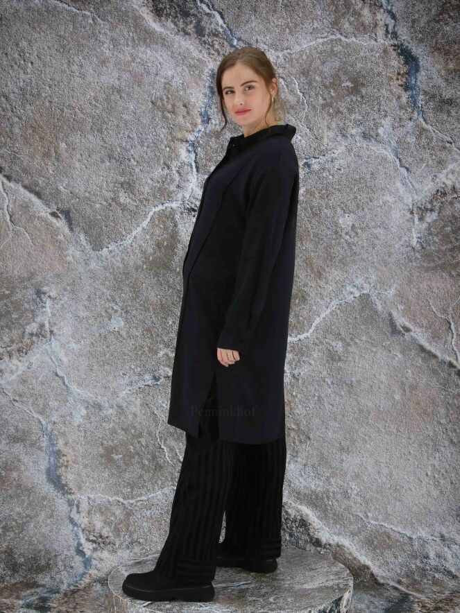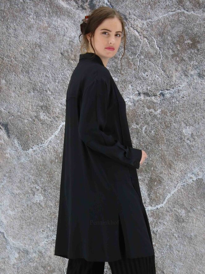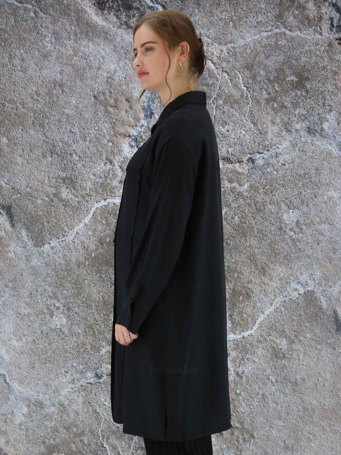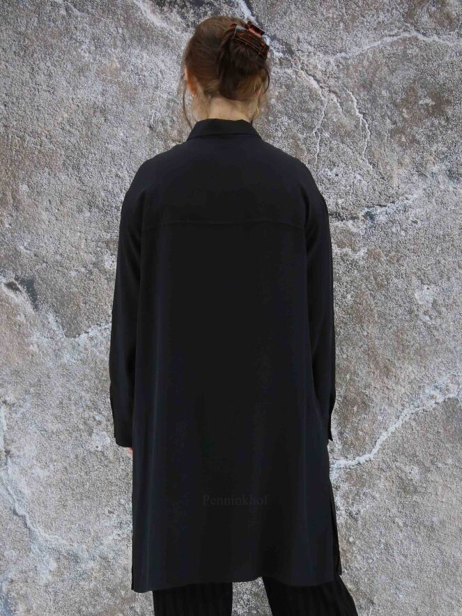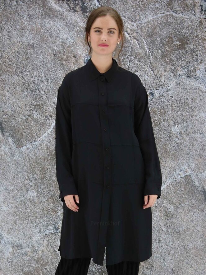 Een lange blouse van Annette Görtz in de kleur zwart. De blouse heeft aan de voorkant een ruitpatroon door omgekeerde stiknaden. Aan de onderkant is aan beide zijkanten een diepe split. deze blouse mag op 30 graden worden gewassen.