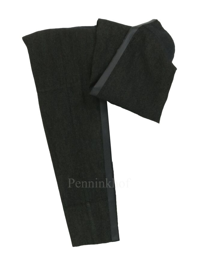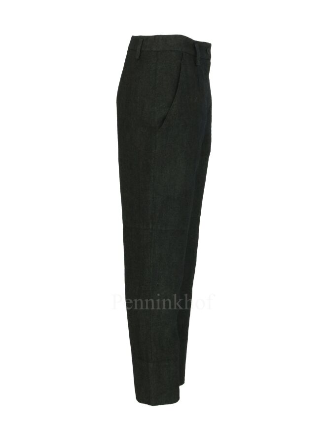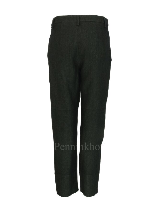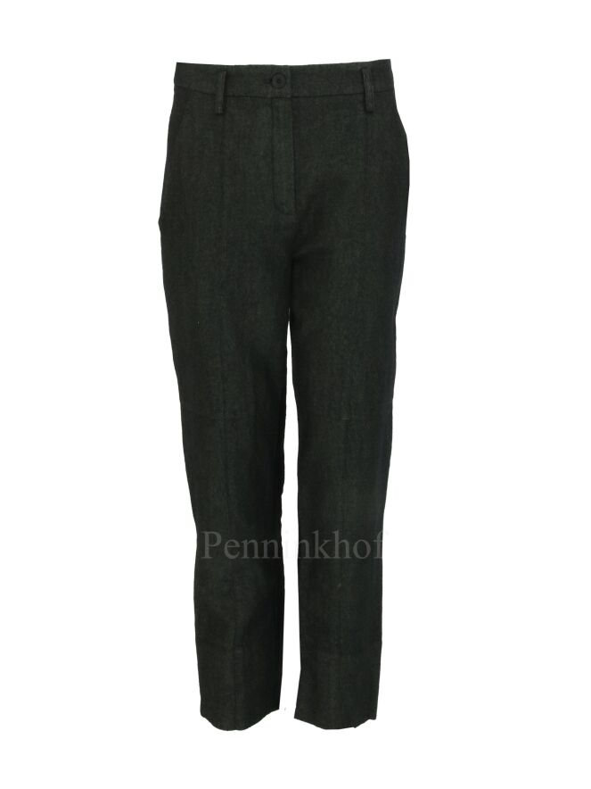 Een gemêleerde broek van Annette Görtz met de kleuren zwart en olijfgroen. De broek heeft steekzakken. Aan de binnenzijde is aan de zijkanten een mat satijnen bies. Deze broek mag op de hand worden gewassen.
