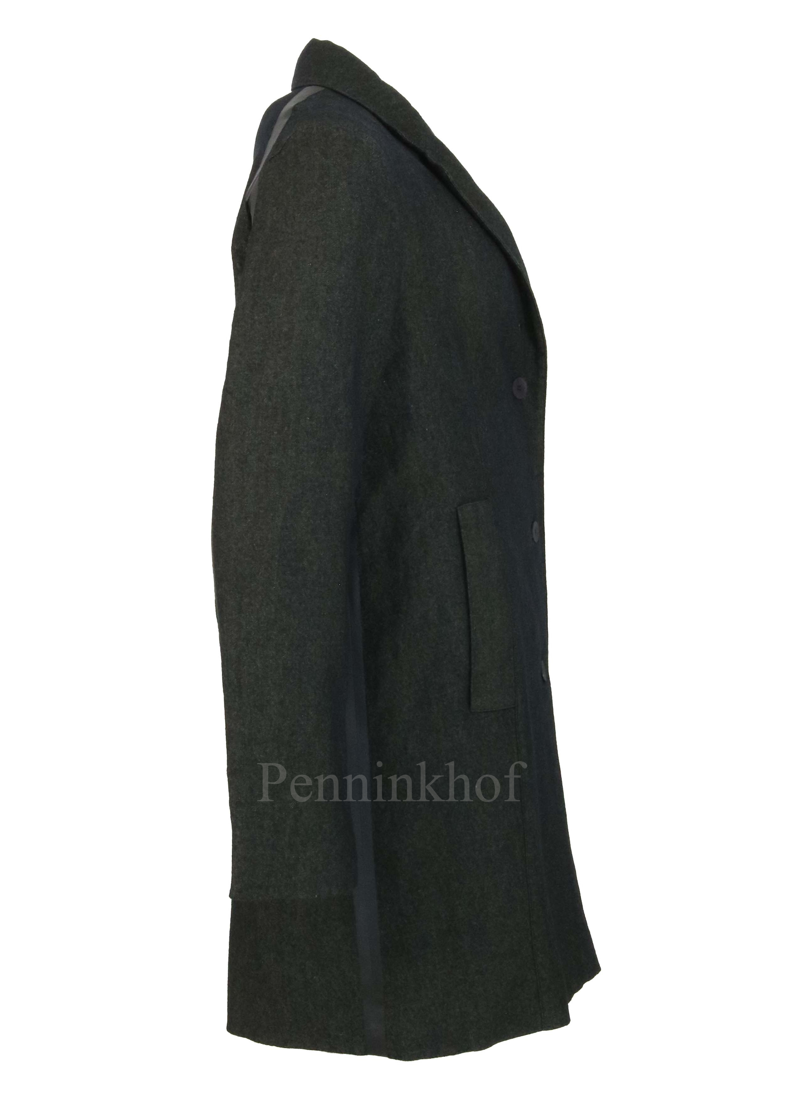 Een lange gemêleerde blazer van Annette Görtz met de kleuren olijfgroen en zwart. De blazer heeft een losse kraag die met drukknopen is bevestigd. Deze losse kraag loopt door tot aan de onderkant van de blazer als een dubbele bies bij de sluiting. De blazer heeft steekzakken en is gevoerd. deze blazer mag niet worden gewassen.