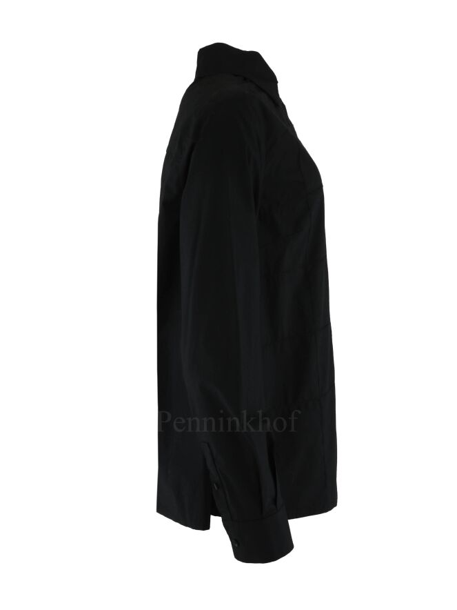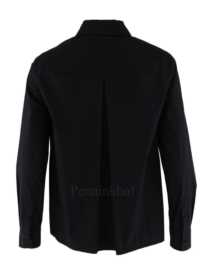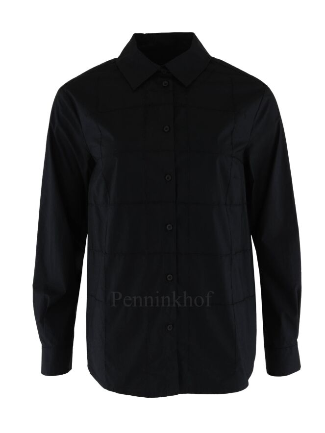 Een blouse van Annette Görtz in de kleur zwart. Aan de voorzijde is een ruitpatroon met fijne stiknaden. Aan de achterzijde is de stof uni met een plooi in het midden ter hoogte van de schouderbladen. Deze blouse mag op 30 graden worden gewassen.