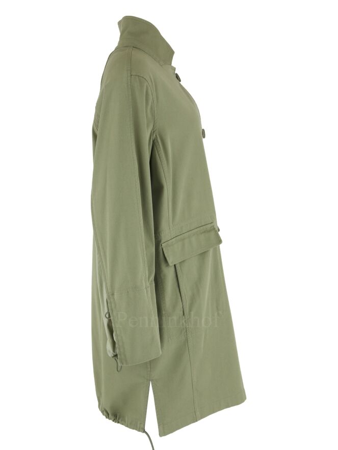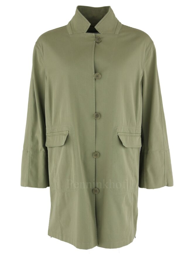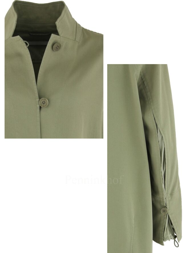 Een halflange blazer van Annette Görtz in een zachte olijfgroene kleur. De blazer heeft een 5 knoops sluiting. Aan de onderkant zijn aan beide zijkanten splitten. Aan de achterkant is aan de onder rand een koord in een tunnel verwerking waarmee een geplooid effect kan worden gecreëerd. deze blazer mag op 30 graden worden gewassen.