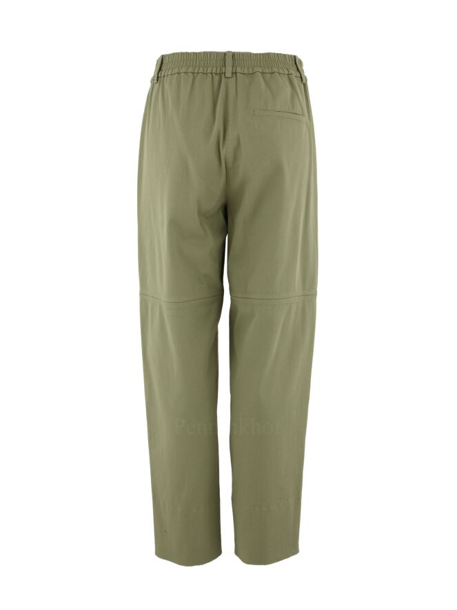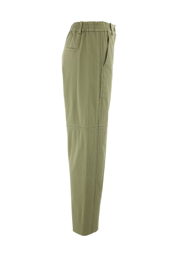 Een broek van Annette Görtz in een lichte olijfgroene kleur. De broek heeft steekzakken. In de taille is vanaf de zijkanten en de gehele achterkant een fijn geribbelde elastieken band. Aan de zijkanten van de pijpen is een open dubbele stiknaad met en mat satijnen bies. Deze broek mag op 30 graden worden gewassen.