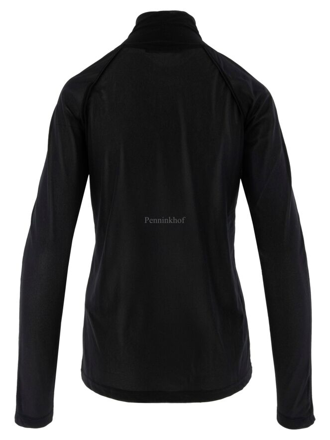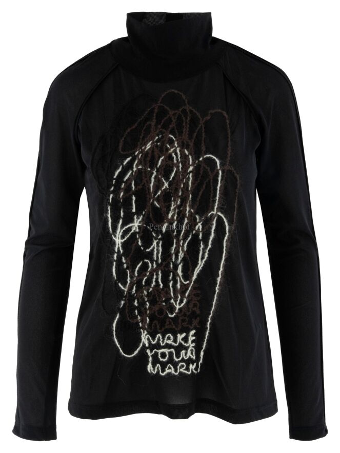Een shirt van Annette Görtz in de kleur zwart met een opgestikt dessin van stiknaden in de kleuren roomwit en mokkabruin. Het shirt heeft in de hals een vallende coll en mag op 30 graden worden gewassen.