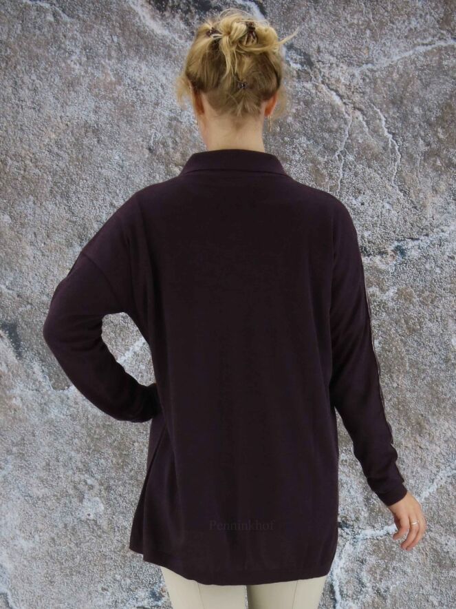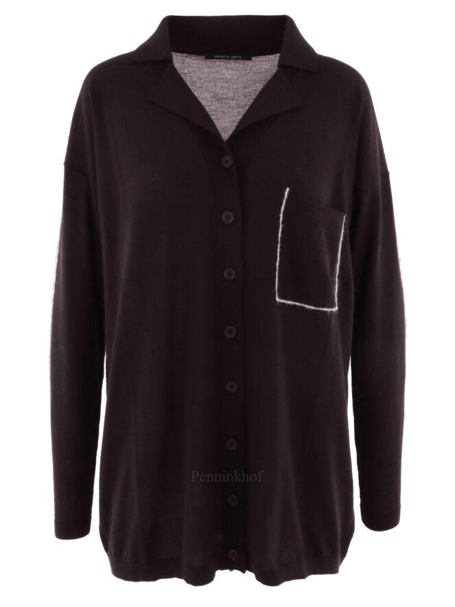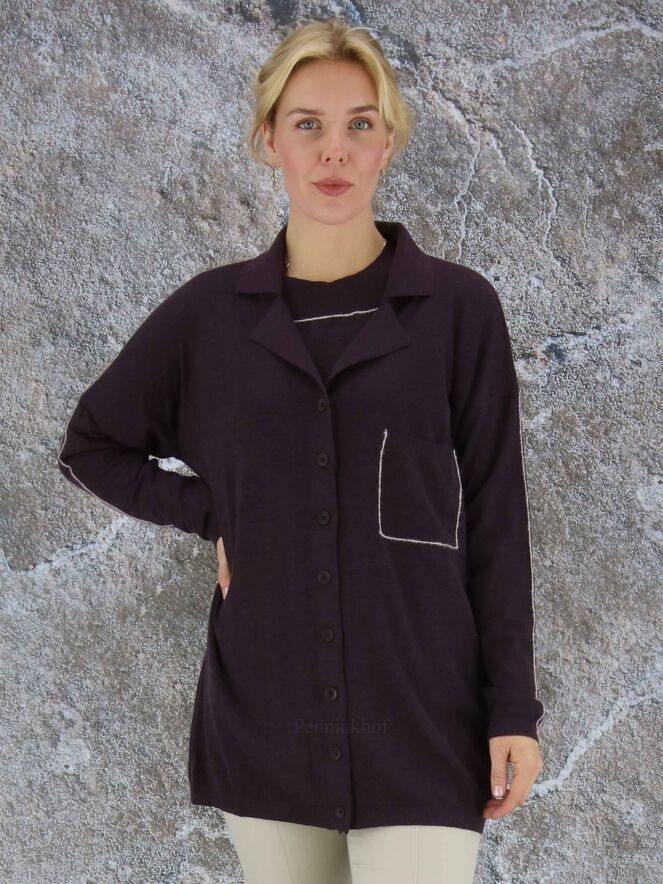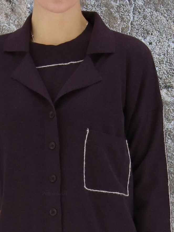 Een luxe vest van Annette Görtz in de kleur aubergine. Over de bovenkant van de mouw en langs de randen van de borstzak is een bies in een room kleur. Dit vest mag op de hand worden gewassen.