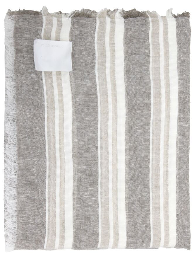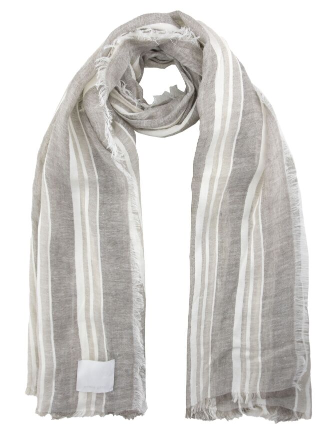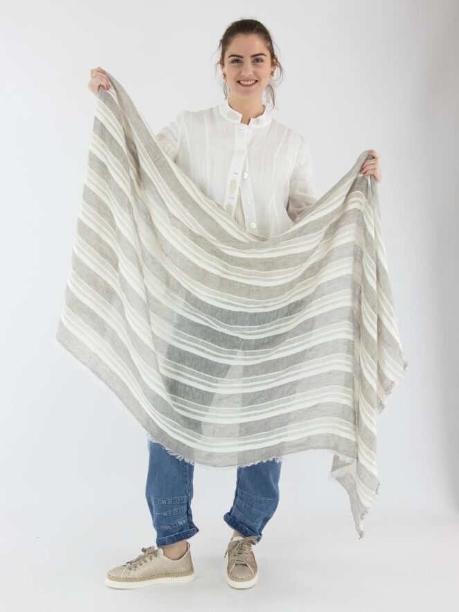 Een licht transparante shawl van Annette Görtz in een strepenpatroon met meerdere tinten beige en roomwit. De randen van de shawl zijn fijn gerafeld. Deze shawl dient met de hand te worden gewassen.