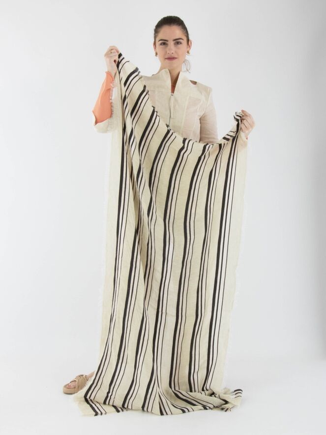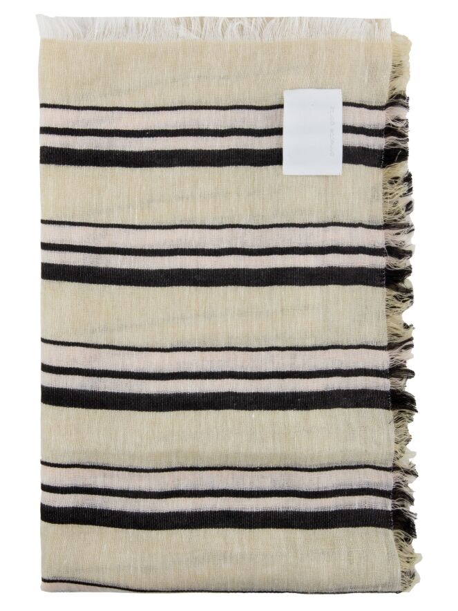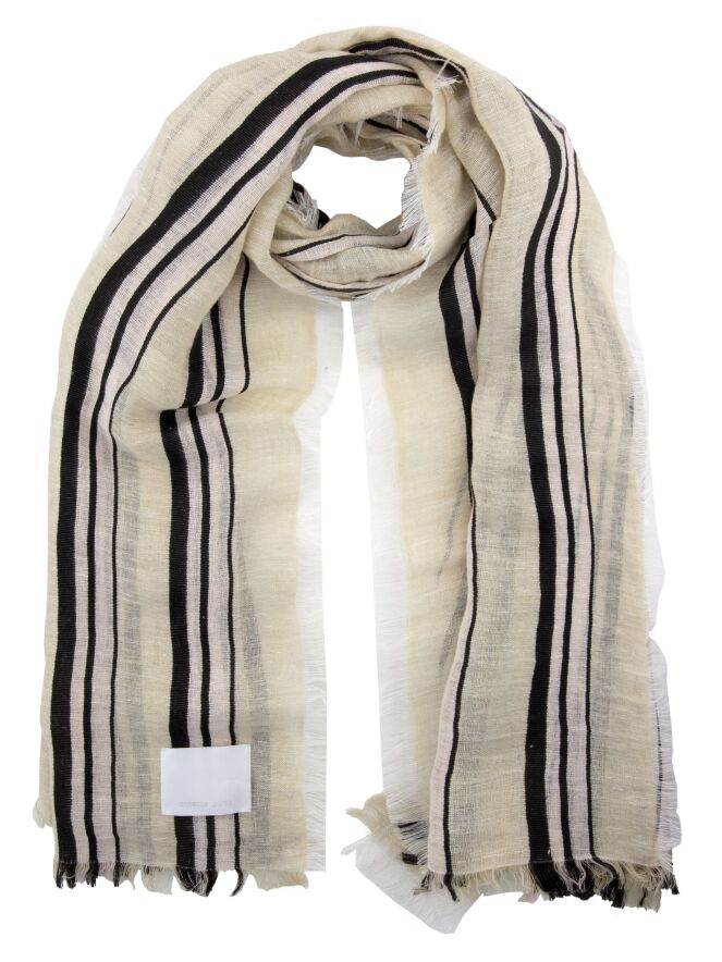 Een licht transparante shawl van Annette Görtz in een strepenpatroon met de kleuren roomwit, mokkabruin en pastelroze. De randen van de shawl zijn fijn gerafeld. Deze shawl dient met de hand te worden gewassen.
