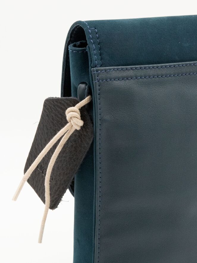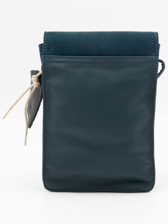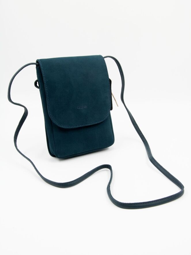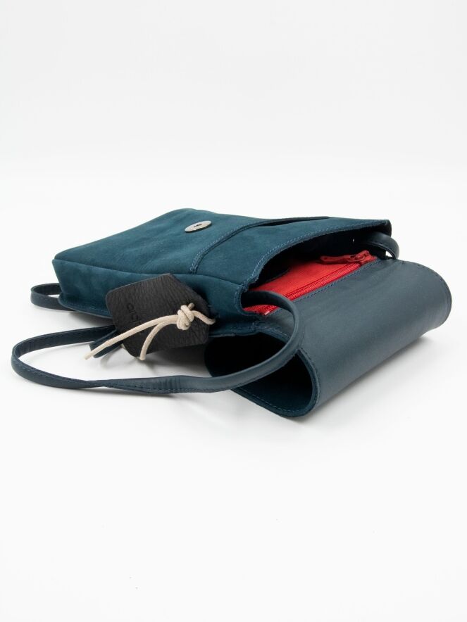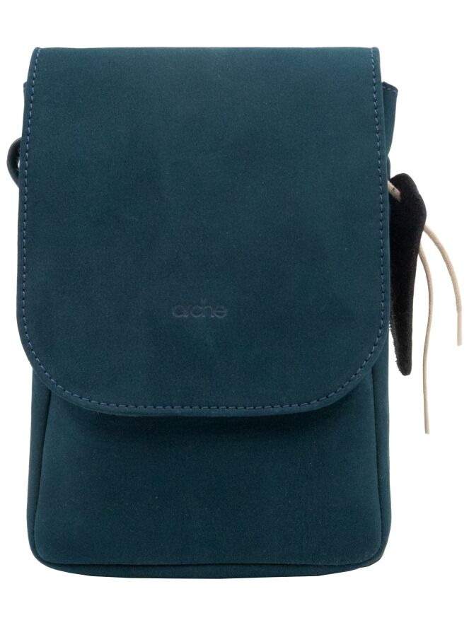Tas van het merk Arche, uitgevoerd in suède in de kleur petrolblauw. De tas heeft een lange schouderband en een klein vakje met rits aan de binnenzijde.