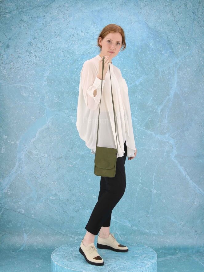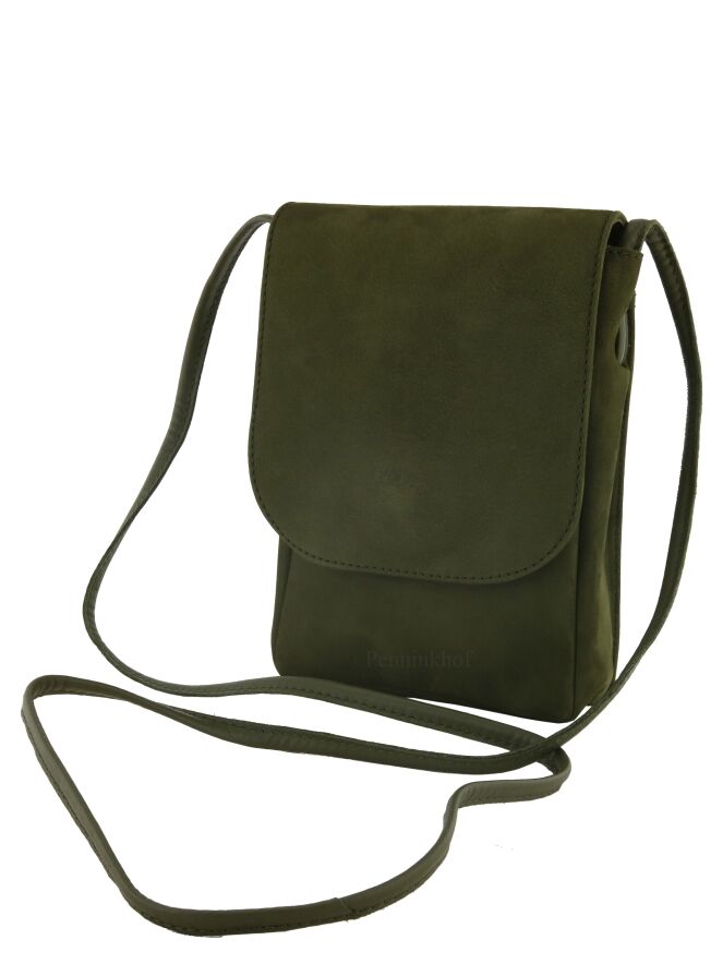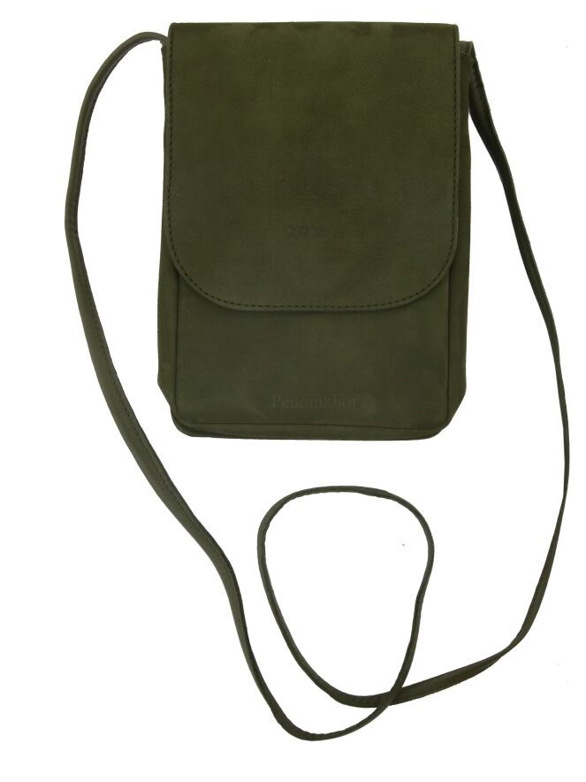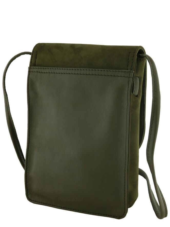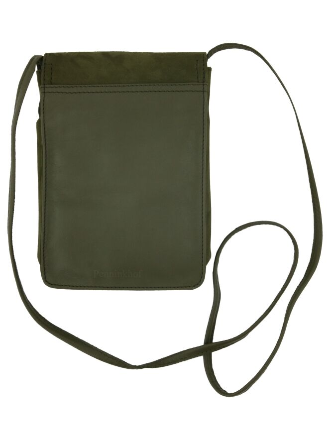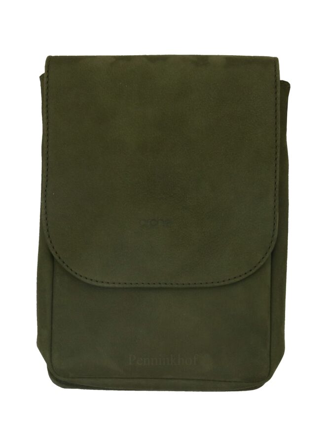 Tas van het merk Arche in suède in de kleur olijfgroen. De tas heeft een lange schouderband en een klein vakje met een rits in de tas.