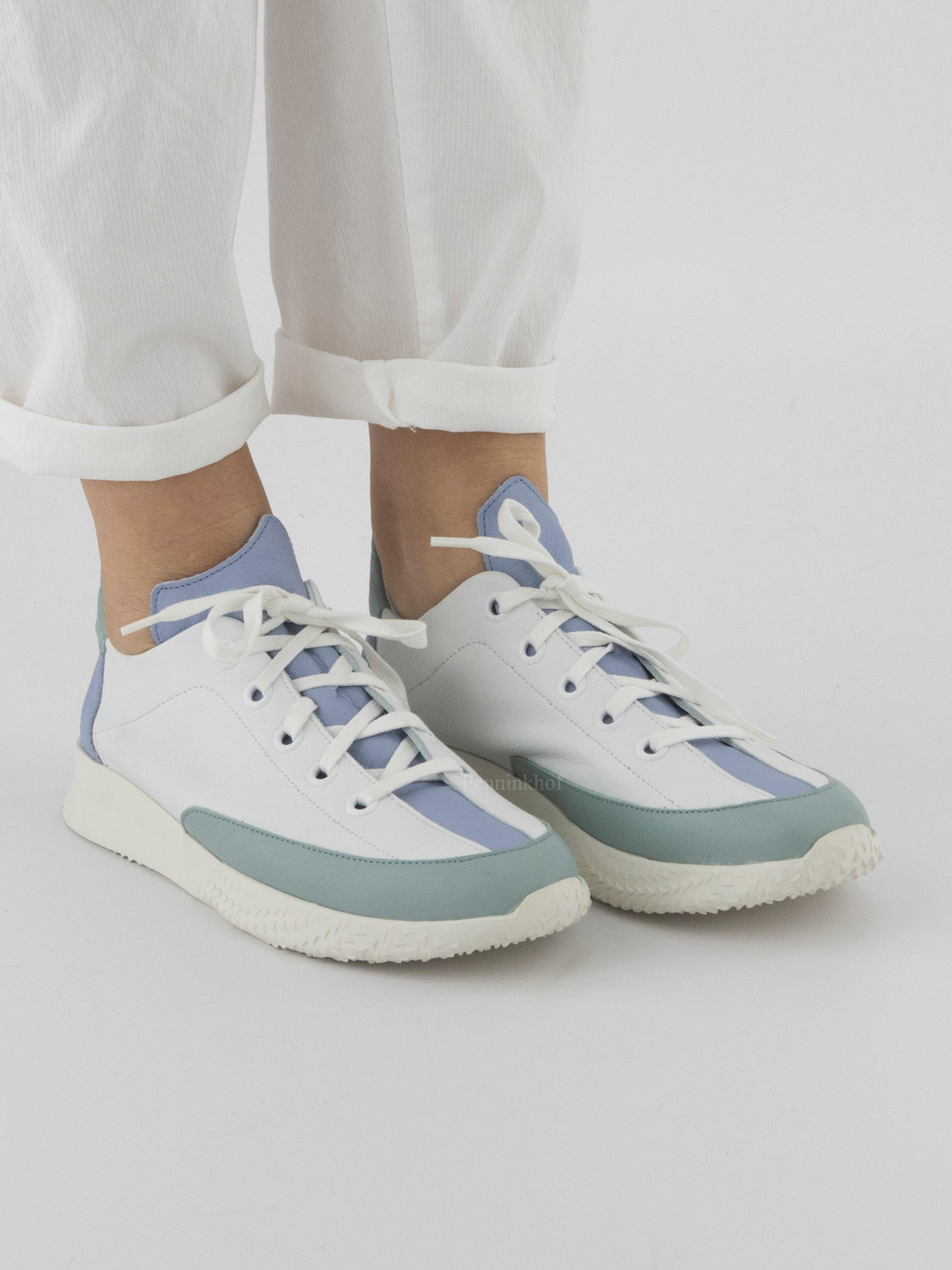 Een sneaker van Arche in de kleur wit. Langs de rand van de voorvoet tot halverwege de sneaker is een pastel blauwgrijs kleurige nubuck bies. De hiel is in een pastel lila kleur met aan de bovenzijde een blauwgrijze top. De witte zool is decoratief driehoekig gekarteld.