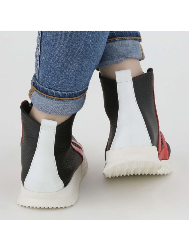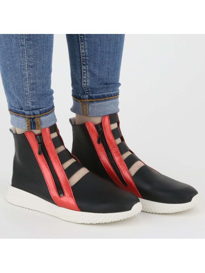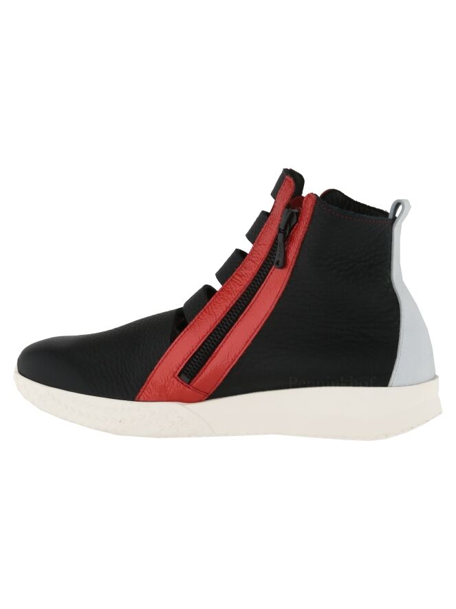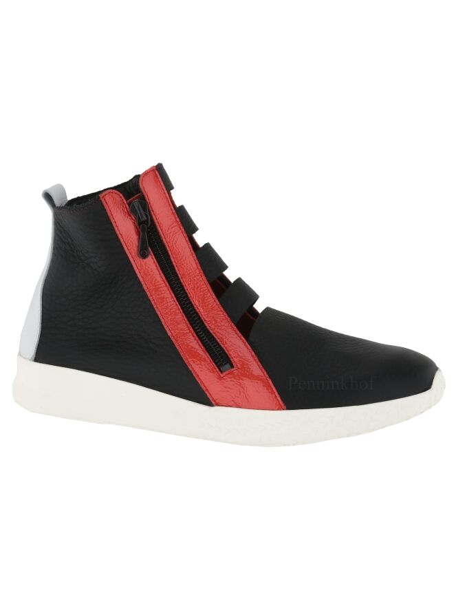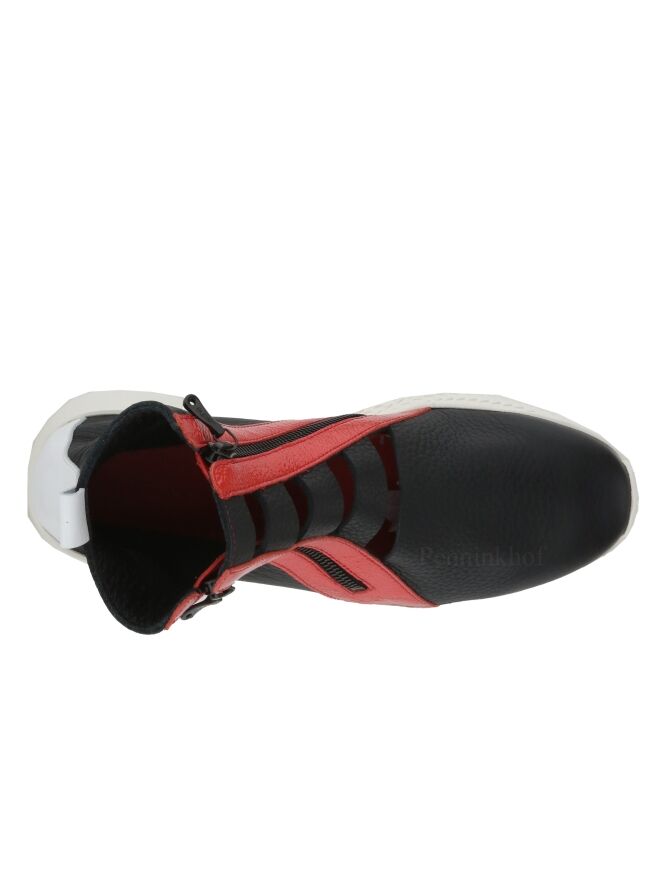 Een hoge sneaker van Arche in de kleur zwart. Langs de zijkanten is een dubbele bies in een lak lederen rode kleur. Op de hiel is wit leder. De voorvoet is deels open. Deze sneaker is ongevoerd.