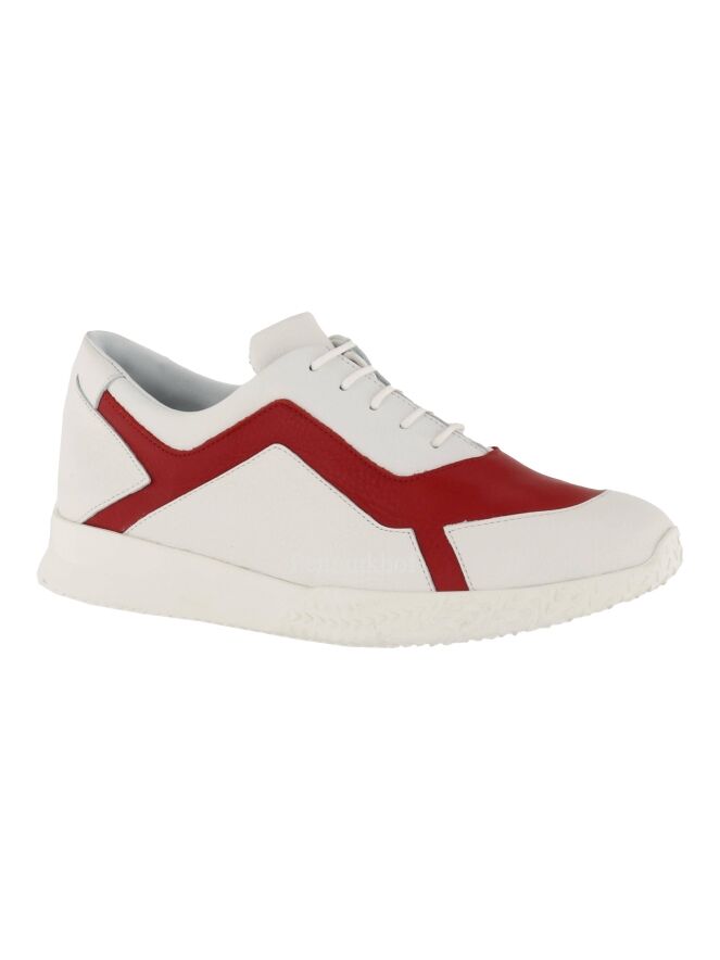 Een sneaker van Arche in 2 kleuren. De hoofdkleur is wit met rode lijnen over de voorvoet en de zijkanten. De binnenkant is met leder gevoerd.