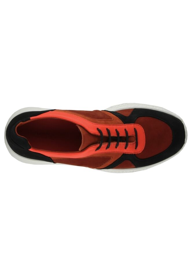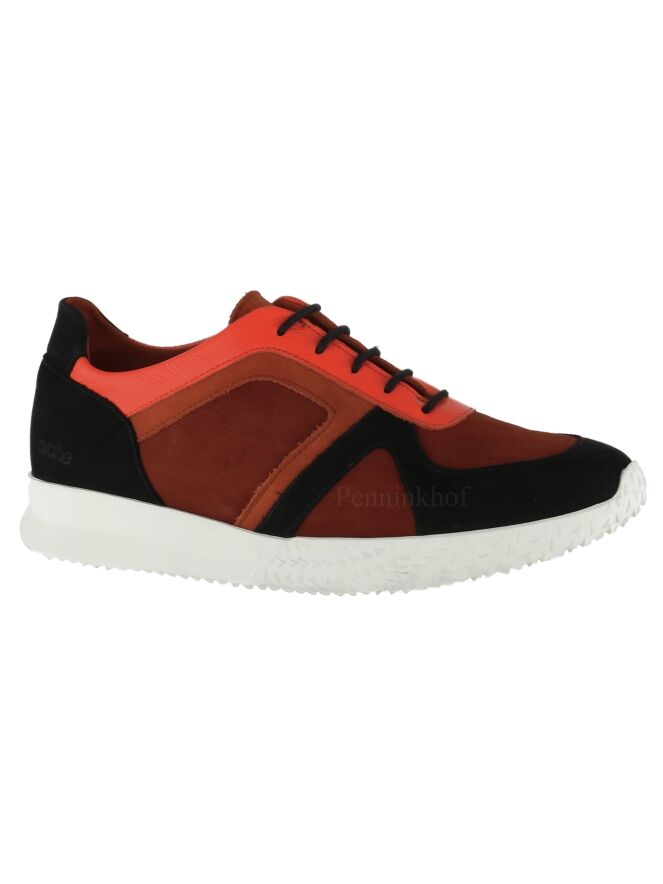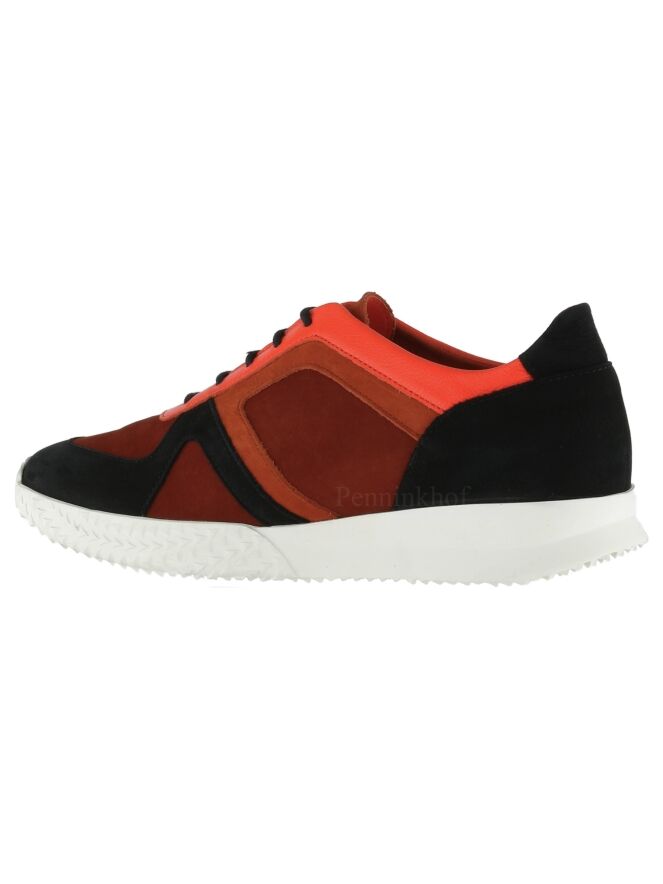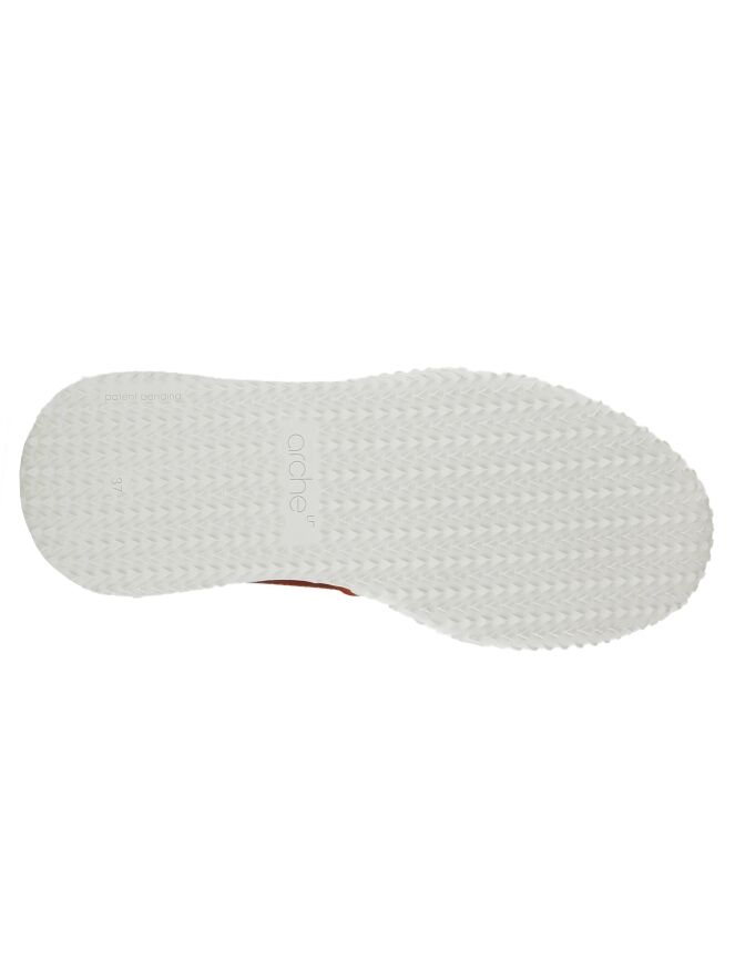 Een sneaker van Arche in de kleuren rood, oranje en roestrood. De neus en de hiel zijn in een nubuck suède. Langs de veter is een mat zwart leder. De binnenkant is ongevoerd.