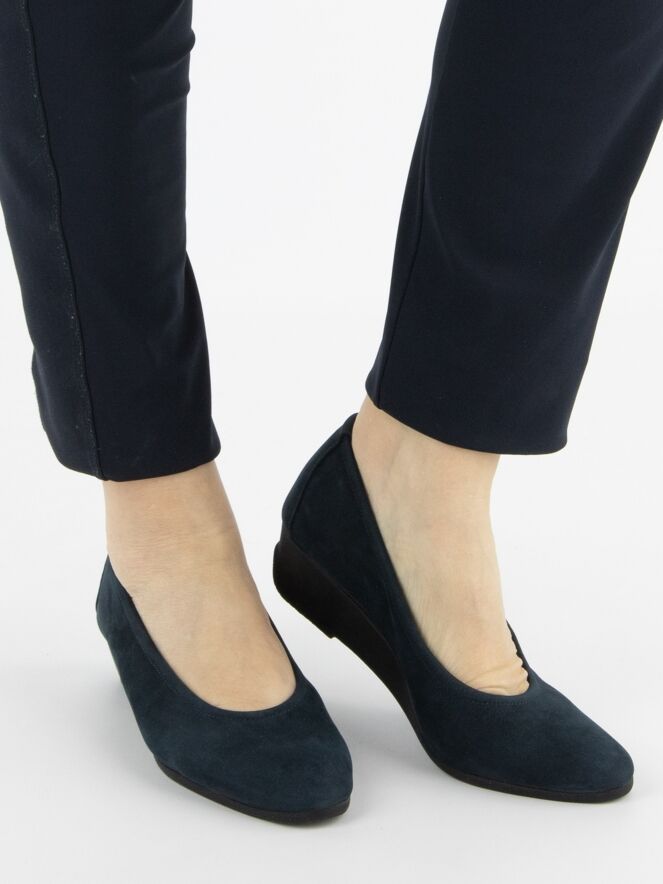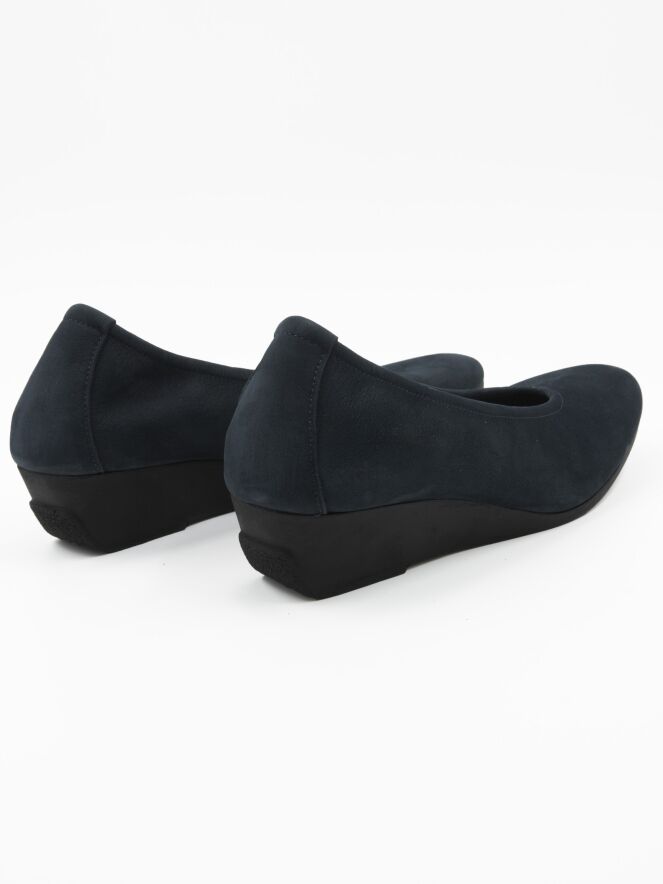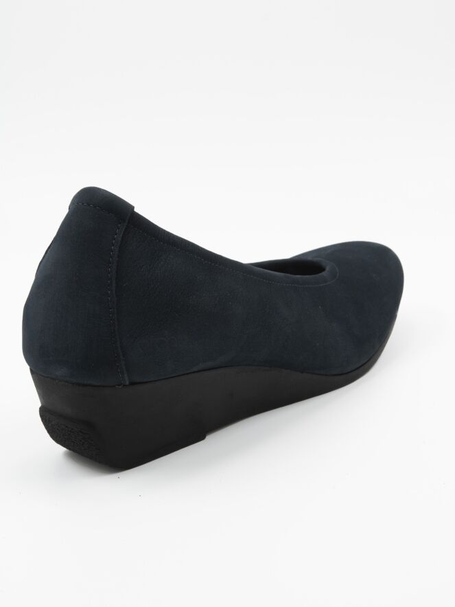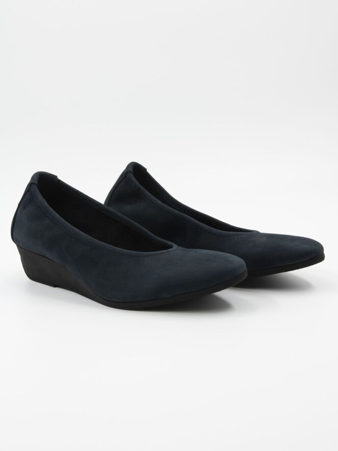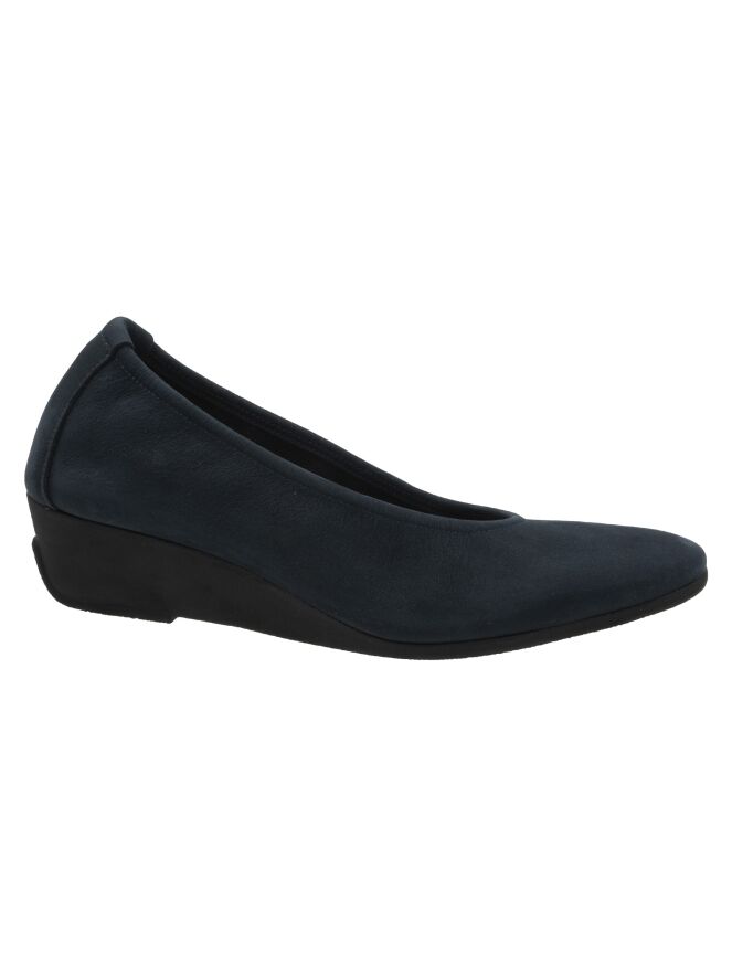 Een instapper van Arche in een marineblauwe kleur. De instapper heeft een latex sleehak en een slanke neus. De binnenkant is ongevoerd.