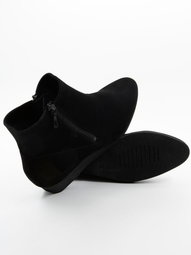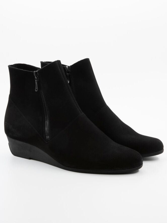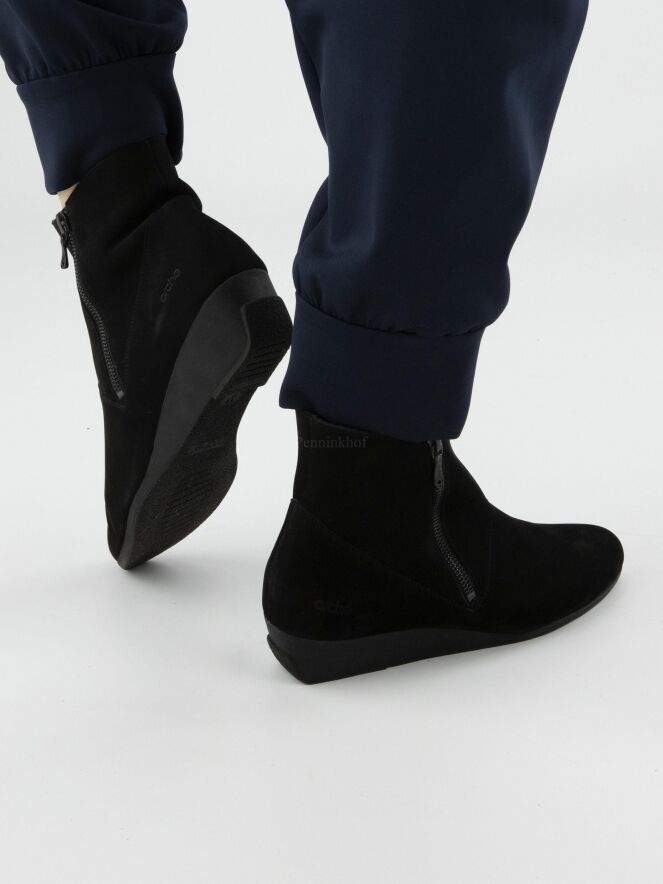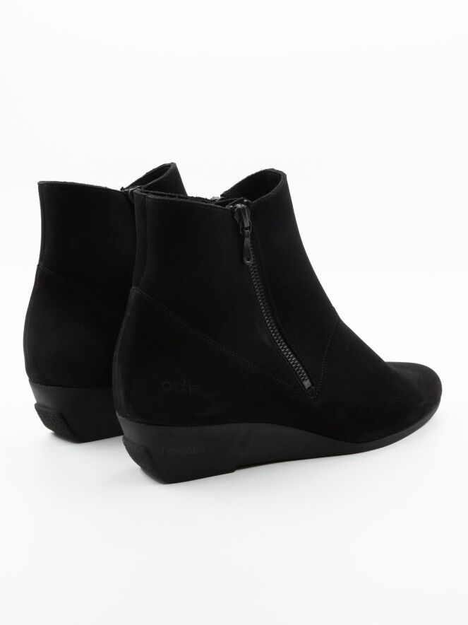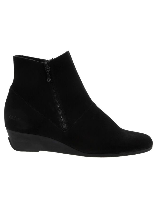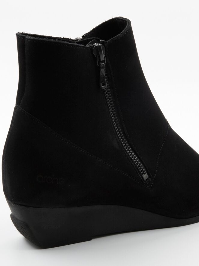 Een enkellaarsje van Arche in de kleur zwart. Het laarsje heeft een slanke neus. Aan beide kanten van de schacht is een rits. De binnenkant is ongevoerd.