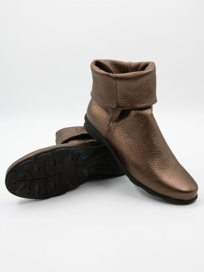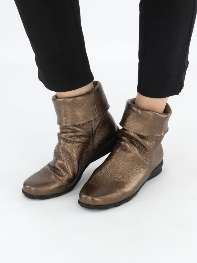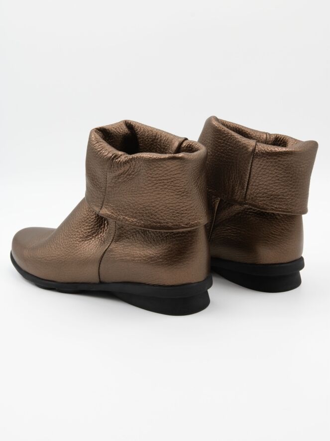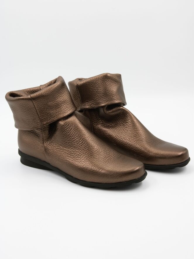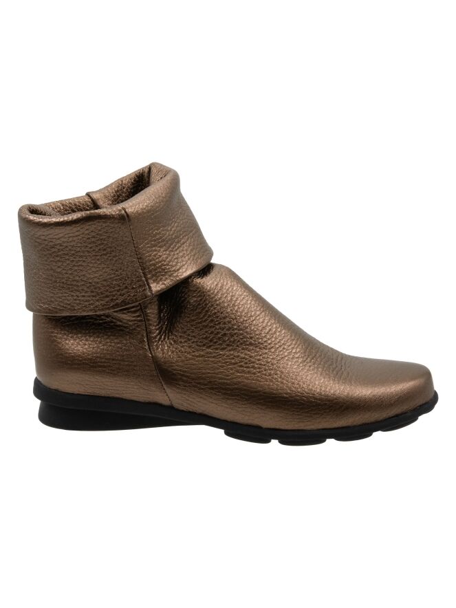 Een enkellaarsje van Arche in een koper kleur. De schacht heeft een brede omslag. De zool is licht verhoogd bij de hiel. De binnenkant is ongevoerd.