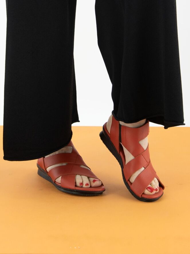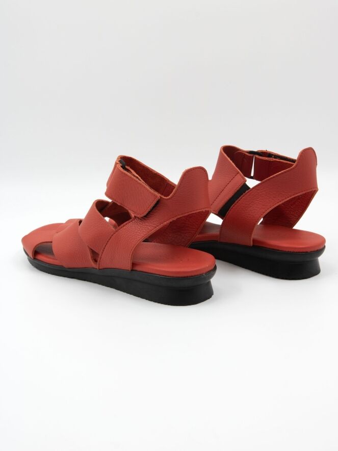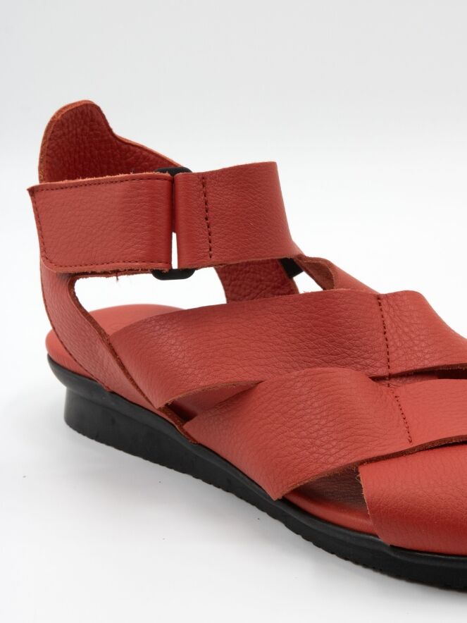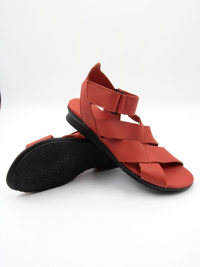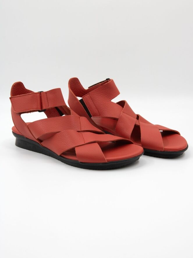 Een sandaal van Arche in de kleur rood. Het leder is gekruist over de voorvoet en de band naar de hiel is verstelbaar met klittenband. Het voetbed is uitgevoerd in hetzelfde leder als de sandaal.