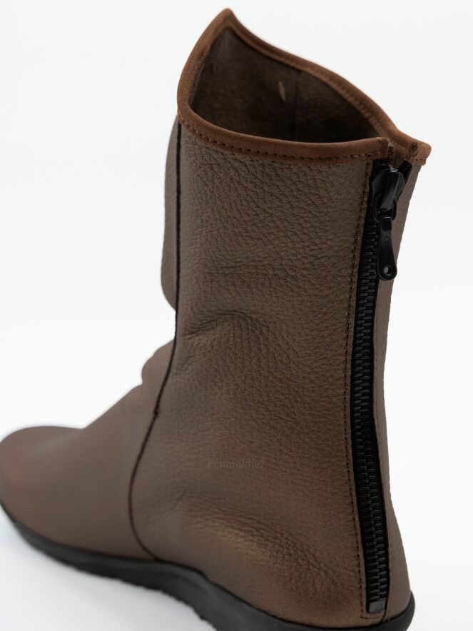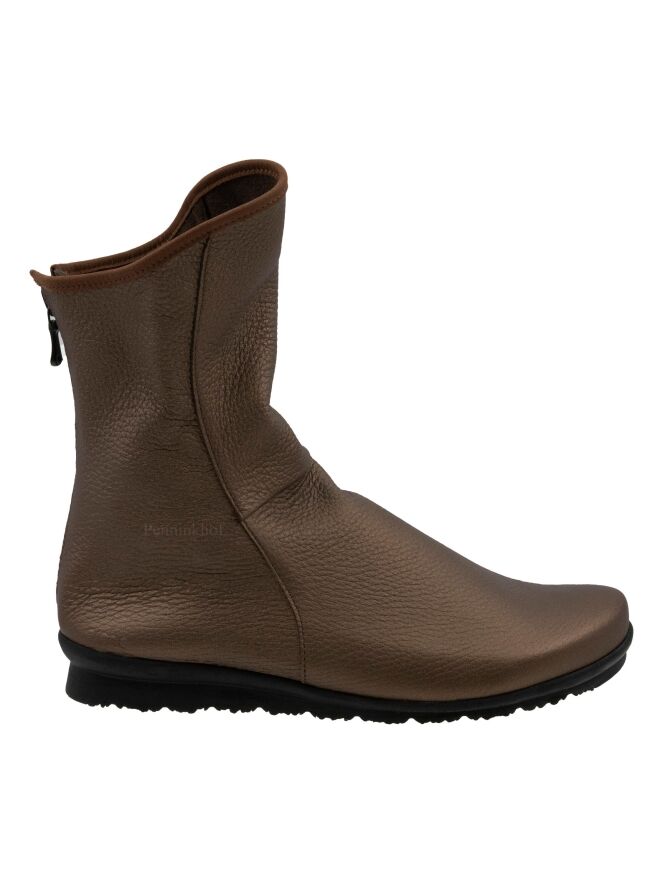 Een laarsje van Arche in de kleur brons. De schacht is aan de voorzijde 5 cm hoger als aan de achterkant. Aan de achterzijde van de schacht is een zwarte rits. Het laarsje heeft een ronde neus en de binnenkant is niet gevoerd.