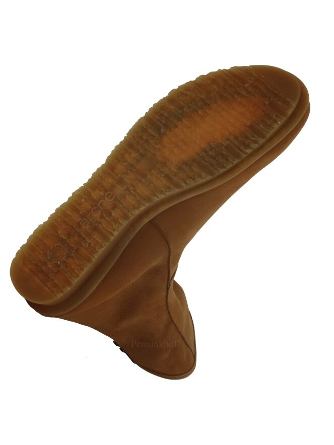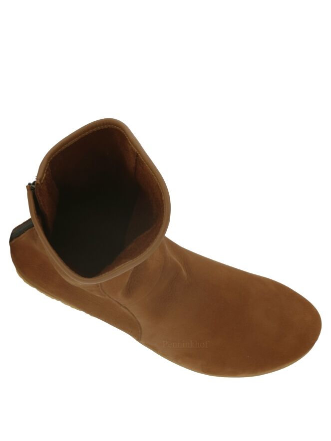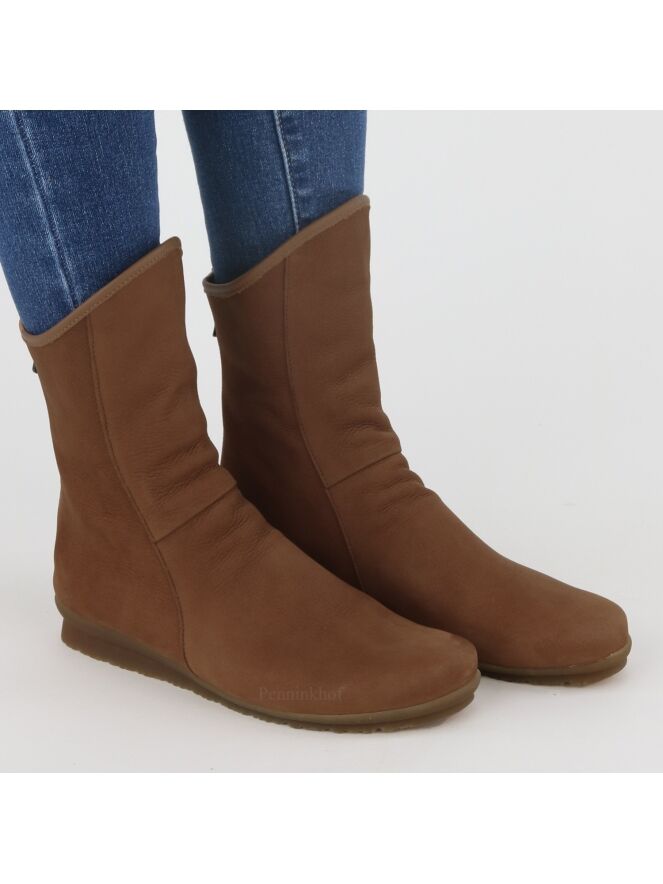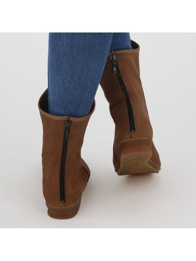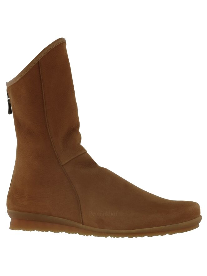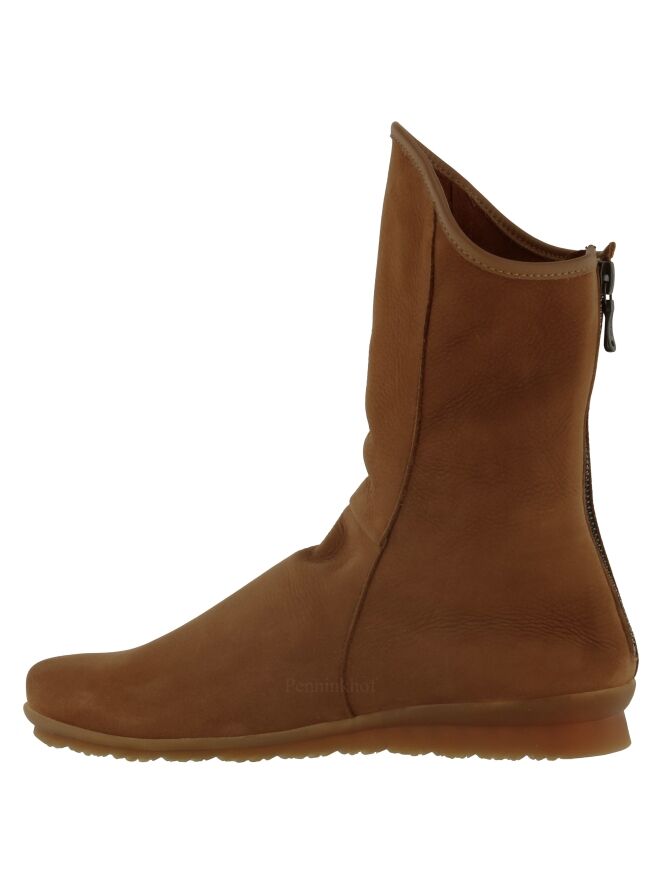 Een laarsje van Arche in de kleur cognac. De schacht is aan de voorzijde 5 cm hoger als aan de achterkant. Aan de achterzijde van de schacht is een zwarte rits. Het laarsje heeft een ronde neus en de binnenkant is niet gevoerd.