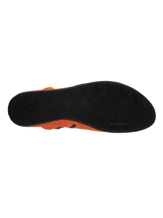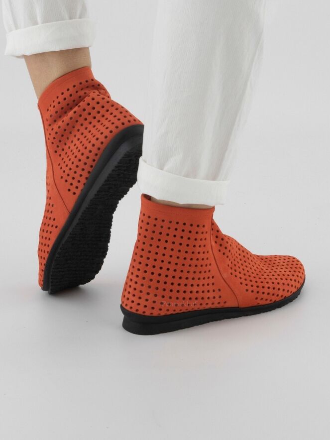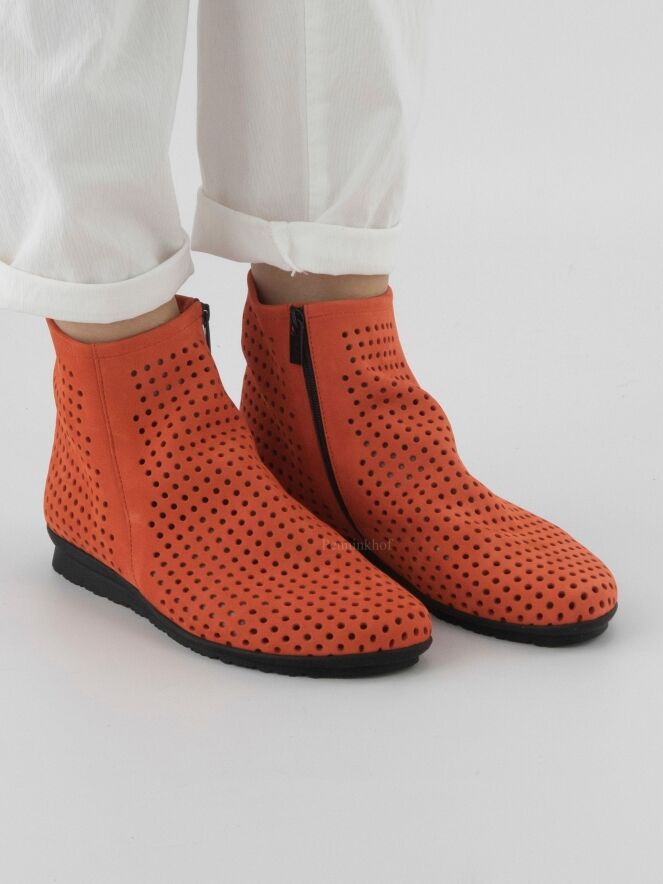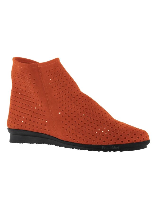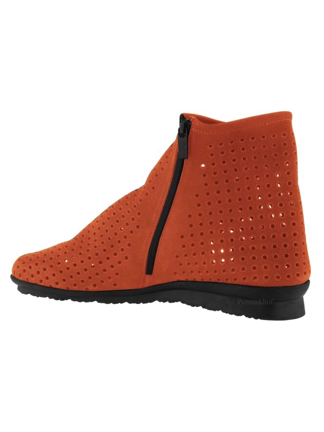 Een kort laarsje van Arche in de kleur oranje. Het nubuck suède is fijn geperforeerd. Aan de binnenzijde is een rits en het laarsje heeft een ronde neus.