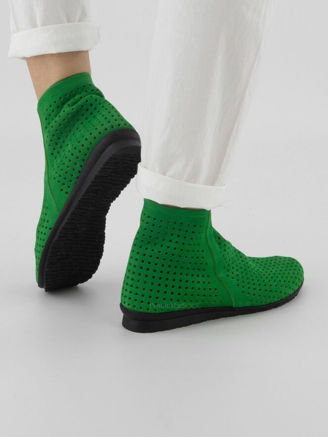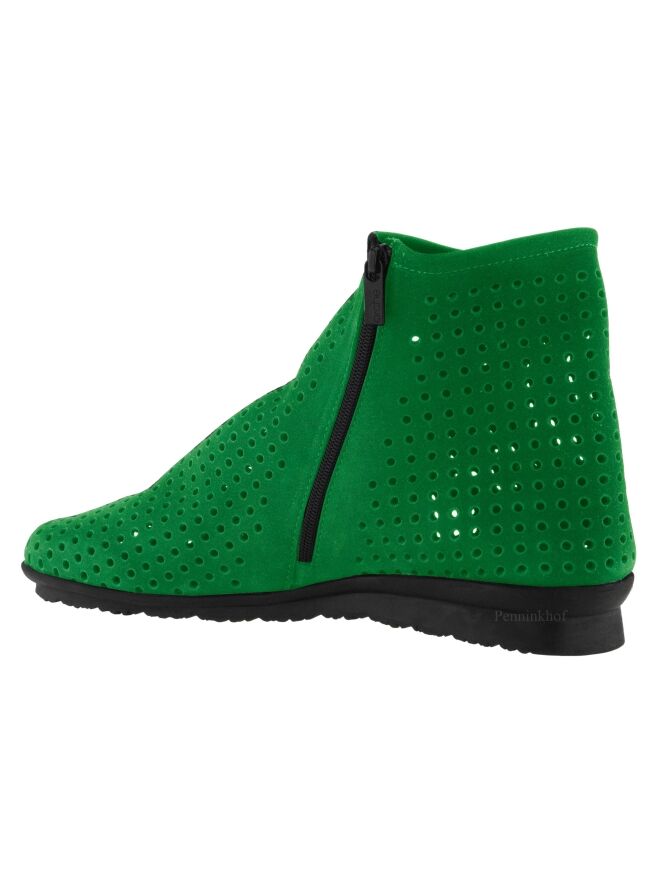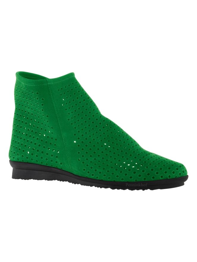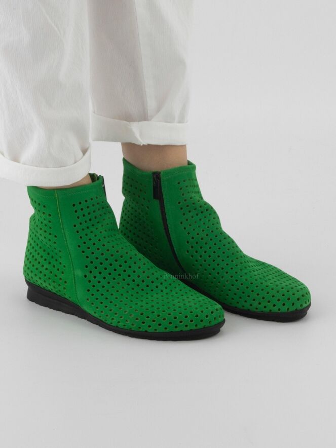 Een kort laarsje van Arche in de kleur groen. Het nubuck suède is fijn geperforeerd. Aan de binnenzijde is een rits en het laarsje heeft een ronde neus.
