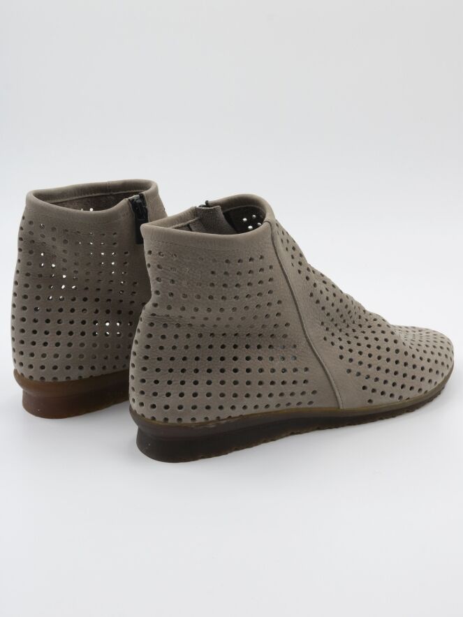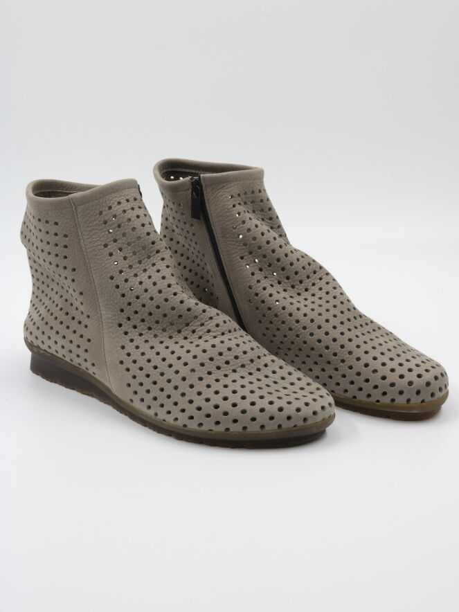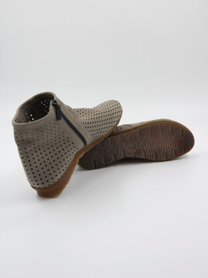Een kort laarsje van Arche in de kleur taupe. Het nubuck suède is fijn geperforeerd. Aan de binnenzijde is een rits en het laarsje heeft een ronde neus.