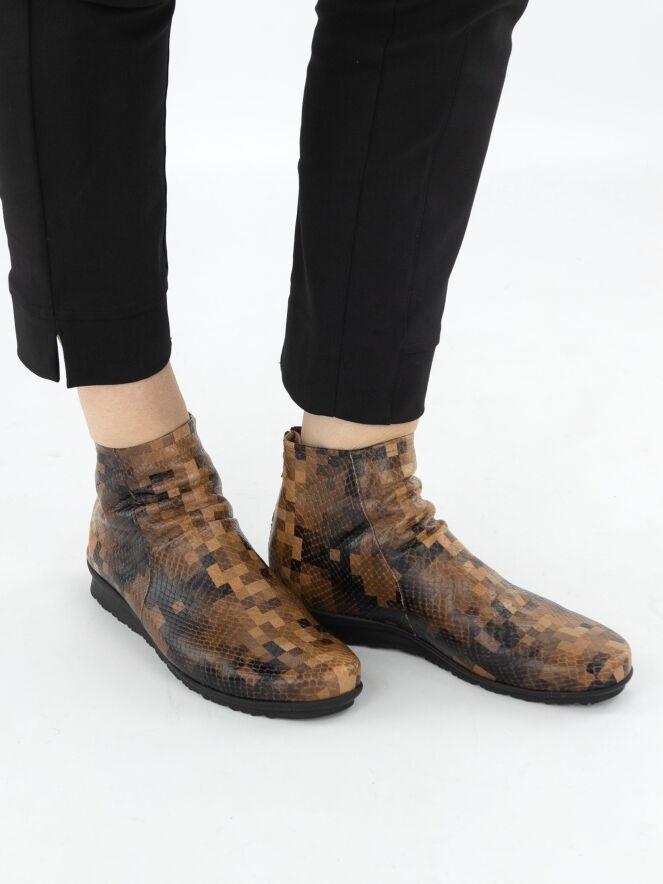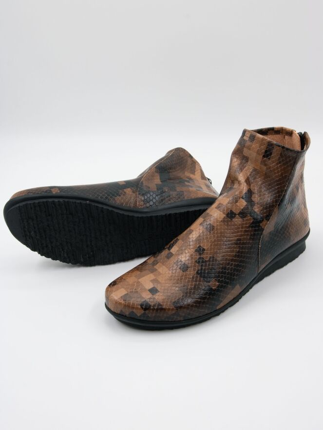 Een kort laarsje van het merk Arche in een geblokte print met meerdere tinten bruin op een reptielstructuur met het ritsje op de hiel. Het laarsje is gemaakt van een zeer zacht leder dat licht glanst en van binnen ongevoerd is. De zool is van latex met een lichte verhoging aan de achterzijde waardoor het draagcomfort extra wordt verhoogd.