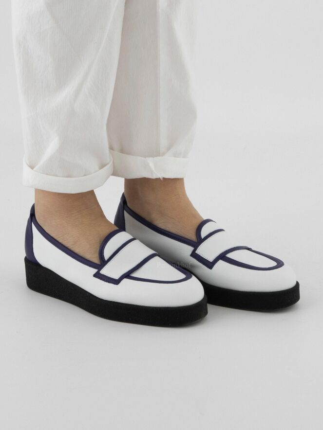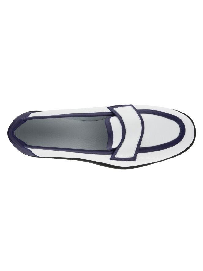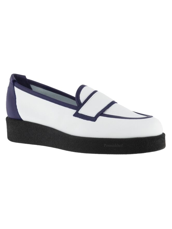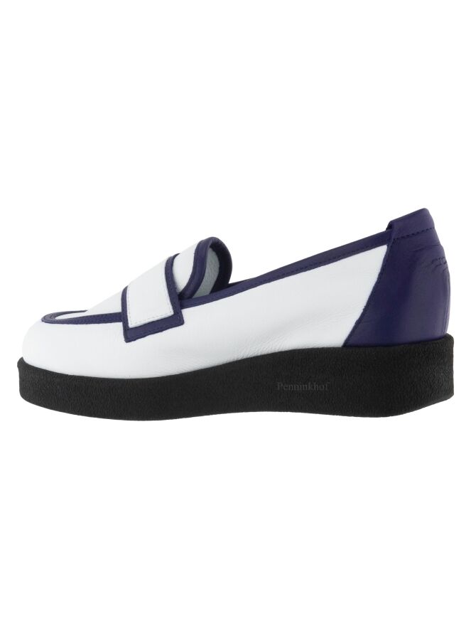 Een instapper van Arche in de kleur wit. Over de voorvoet en langs de rand van de schacht is een donker paarse lederen bies. De hiel is in een donker paars leder.