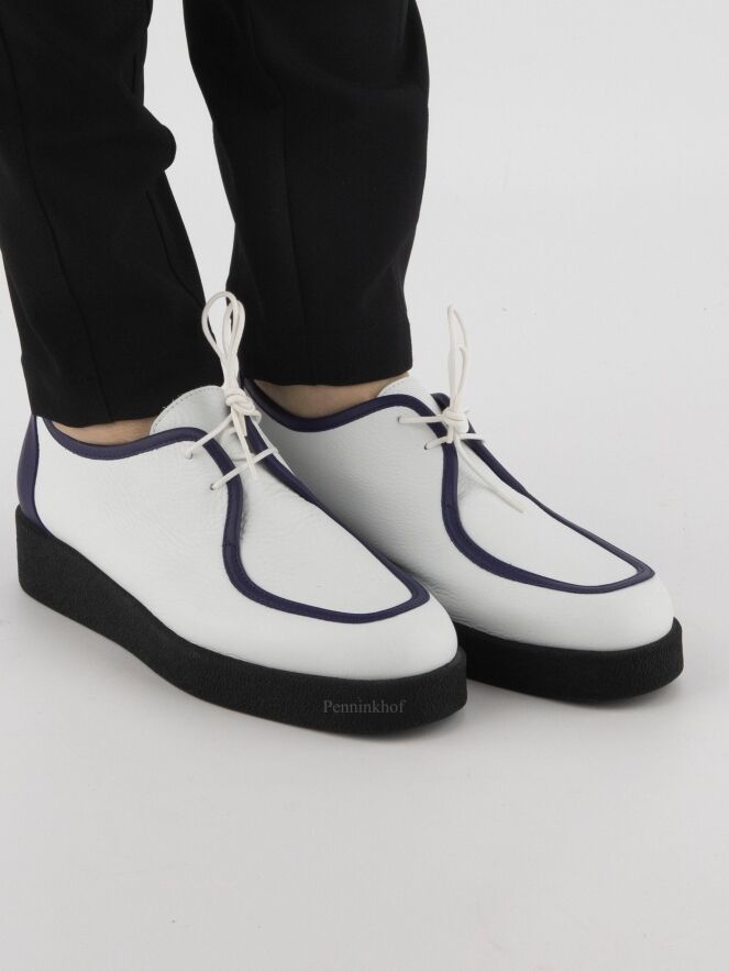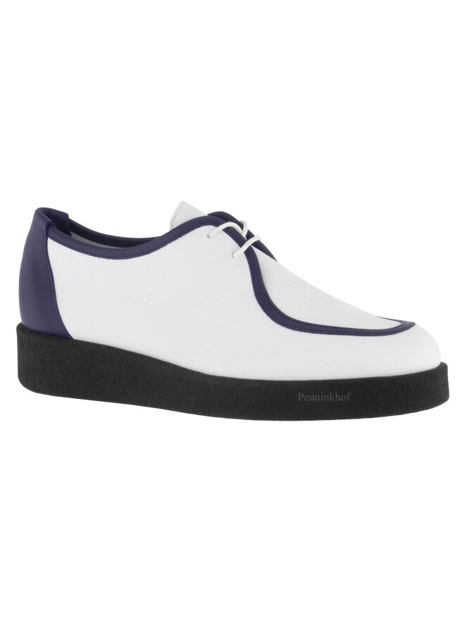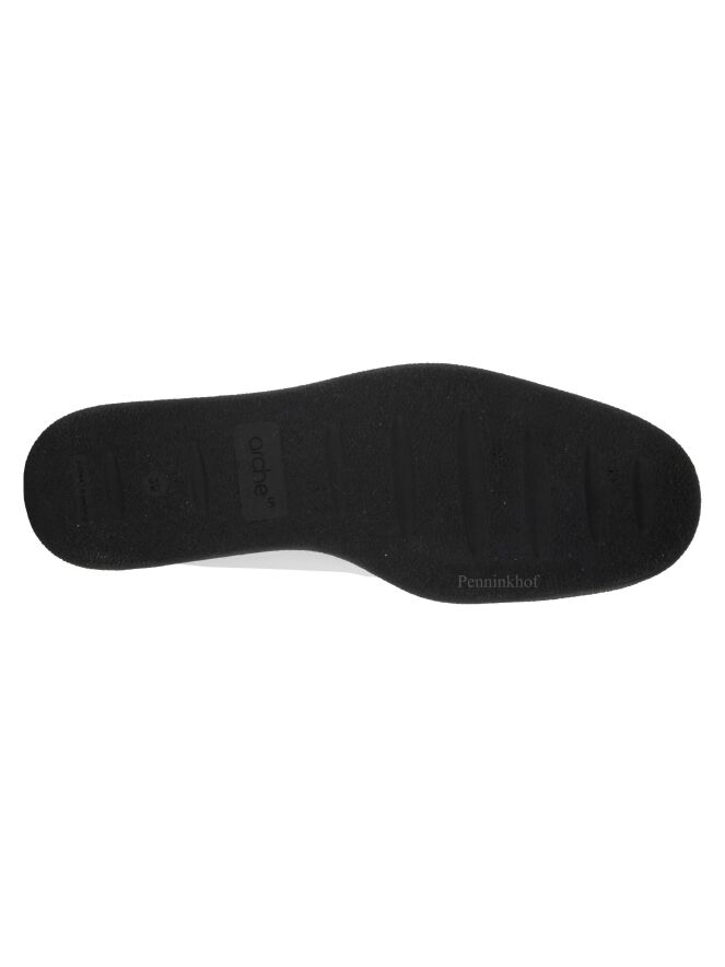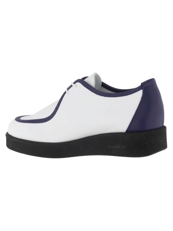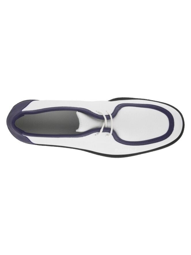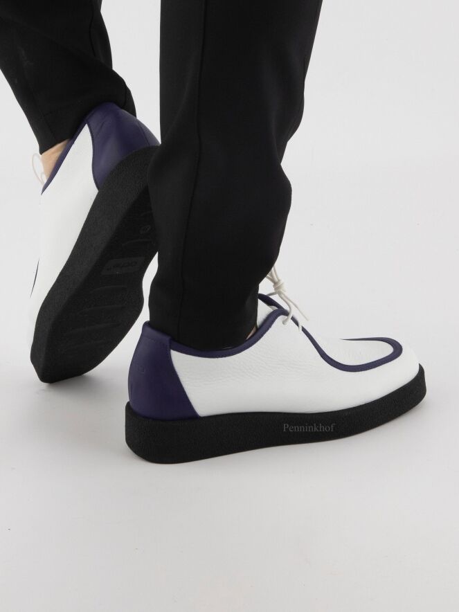 Een instapper van Arche in de kleur wit. Over de voorvoet en langs de rand van de schacht is een paarse lederen bies. Op de voorvoet is een decoratieve veter. De hiel is in een paars leder.