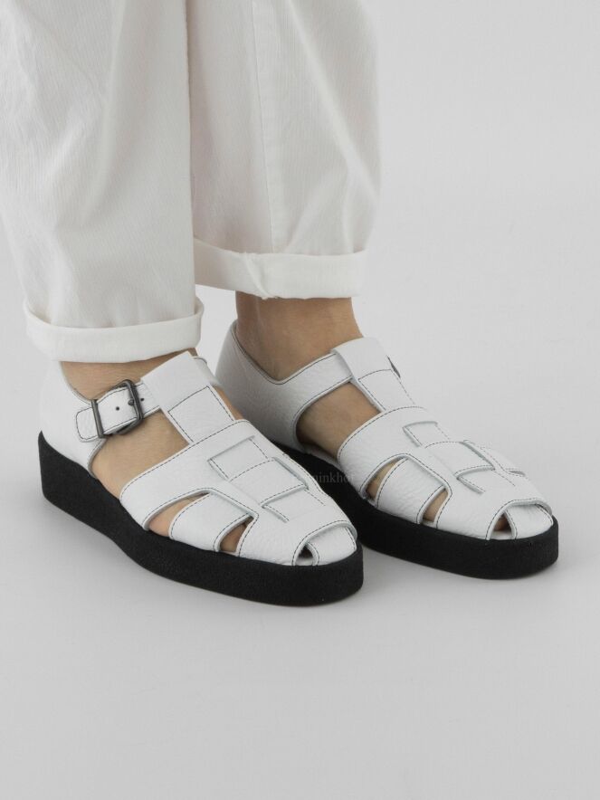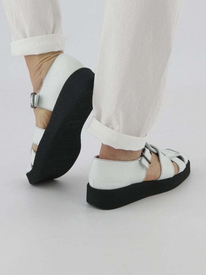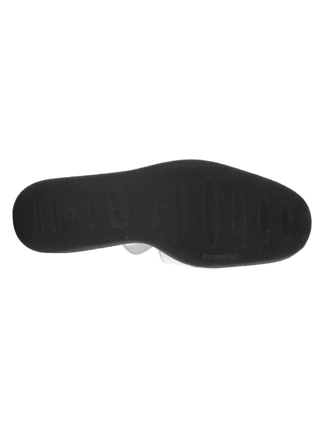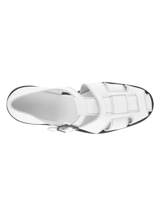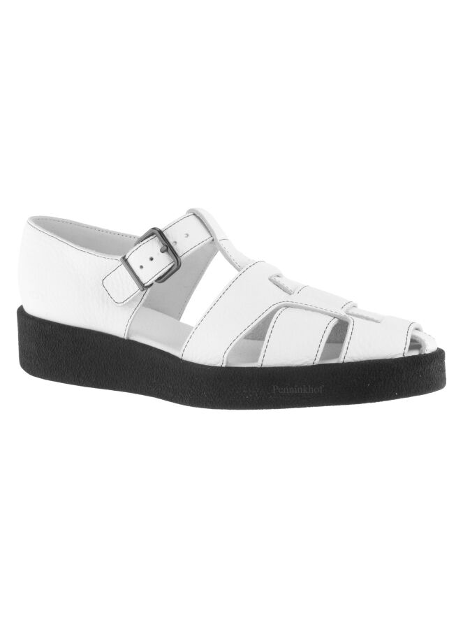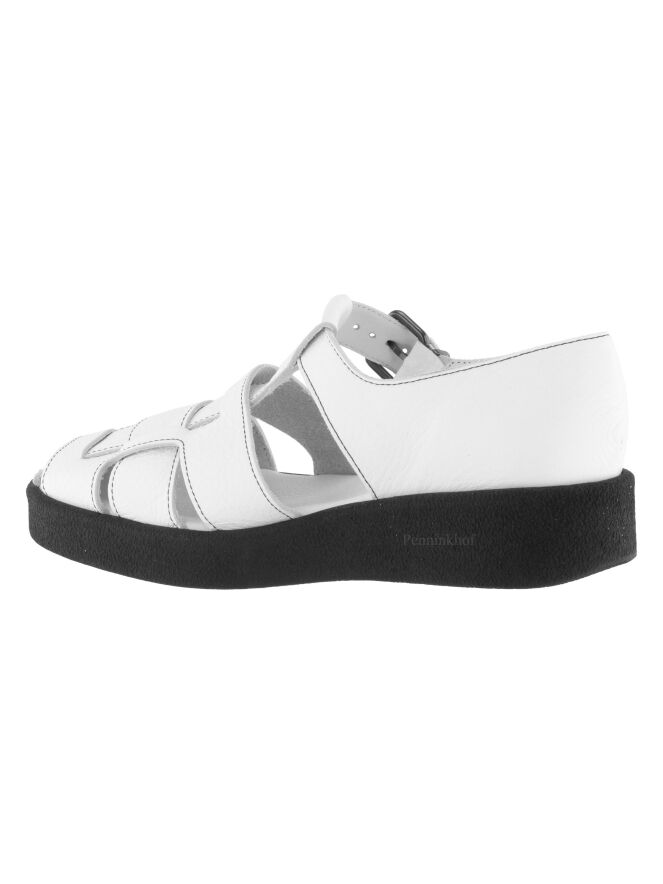 Een open sandaal van Arche in wit leder. Over de voorvoet zijn 3 banden met in het midden een band vanaf de neus naar de wreef. De sandaal heeft een riempje die verstelbaar is. De zool is in de kleur zwart.