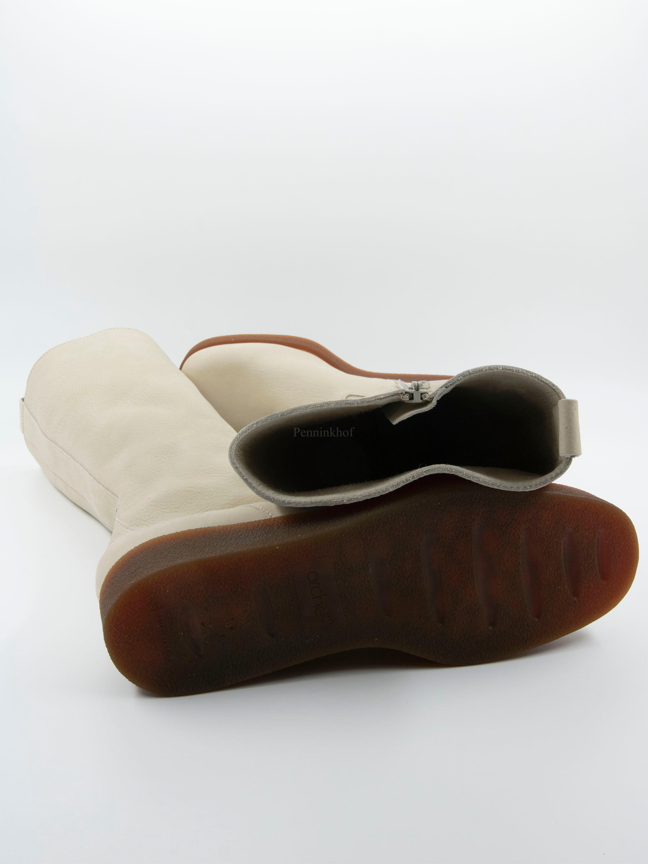 Een hoge laars van Arche in de kleur roomwit. Aan de binnenzijde van de schacht is een rits. De zool is in een cognac kleur. De binnenkant is ongevoerd.