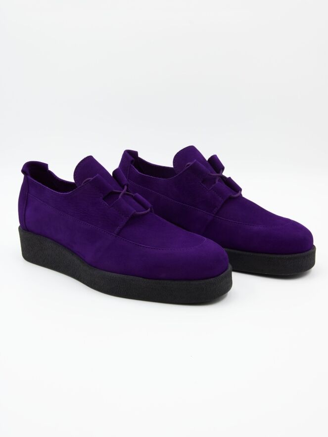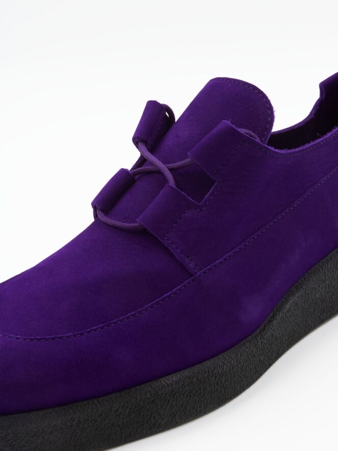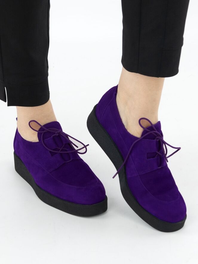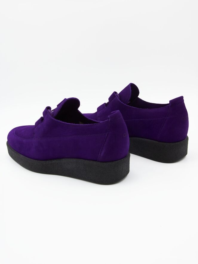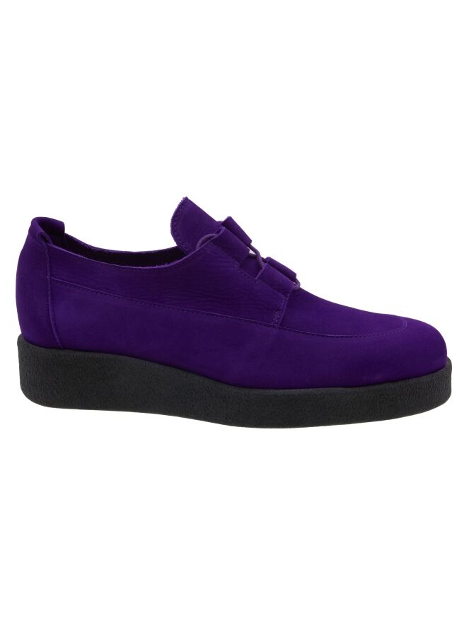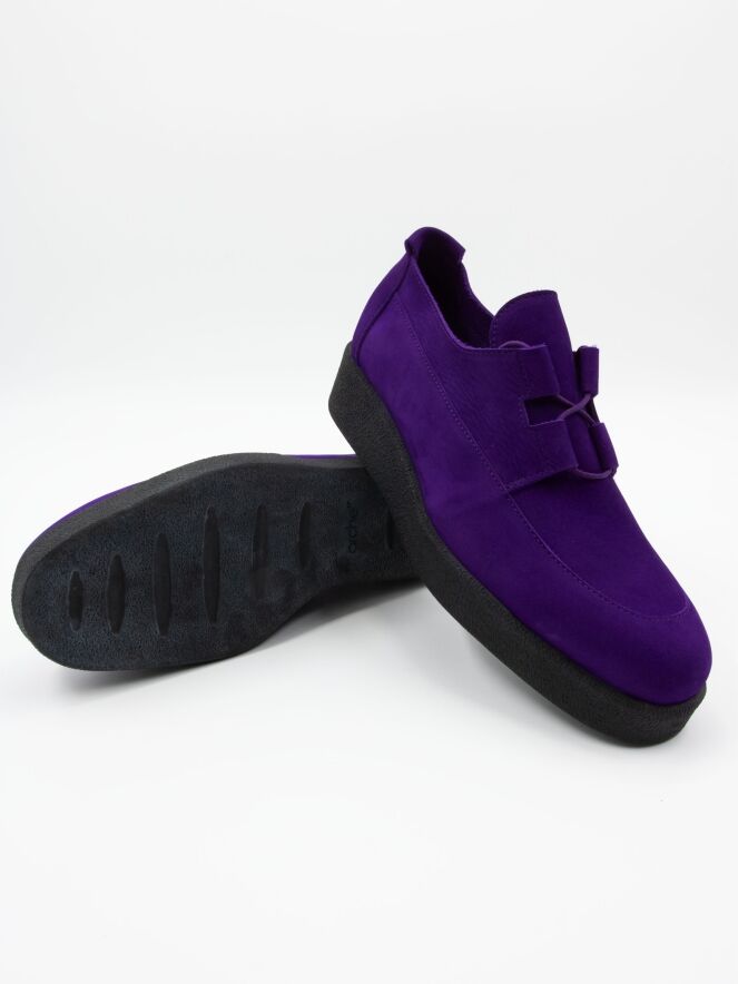 Een veterschoen van Arche in de kleur paars. De schoen heeft 4 brede veterlussen. De plateauzool is in de kleur zwart. De binnenkant is ongevoerd.