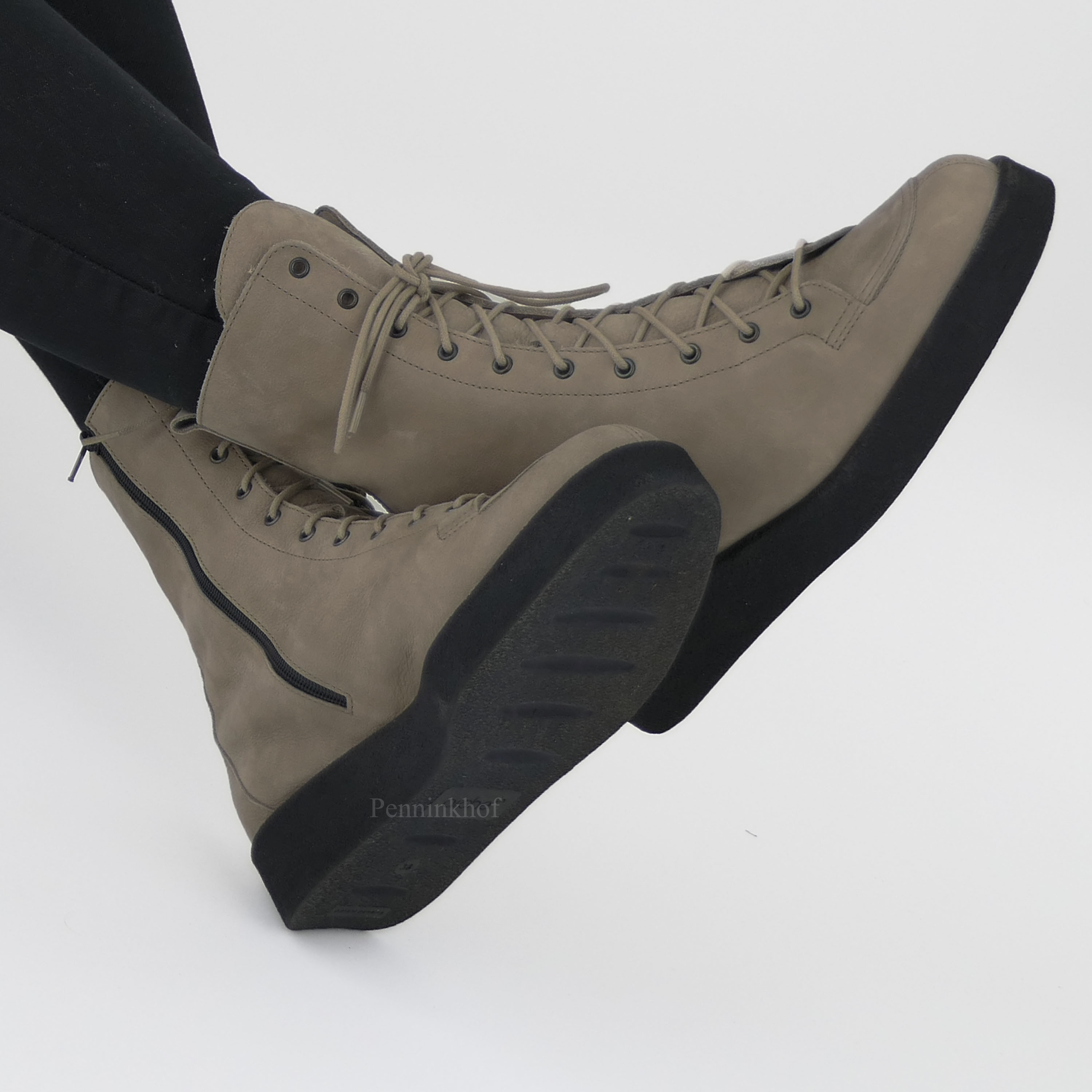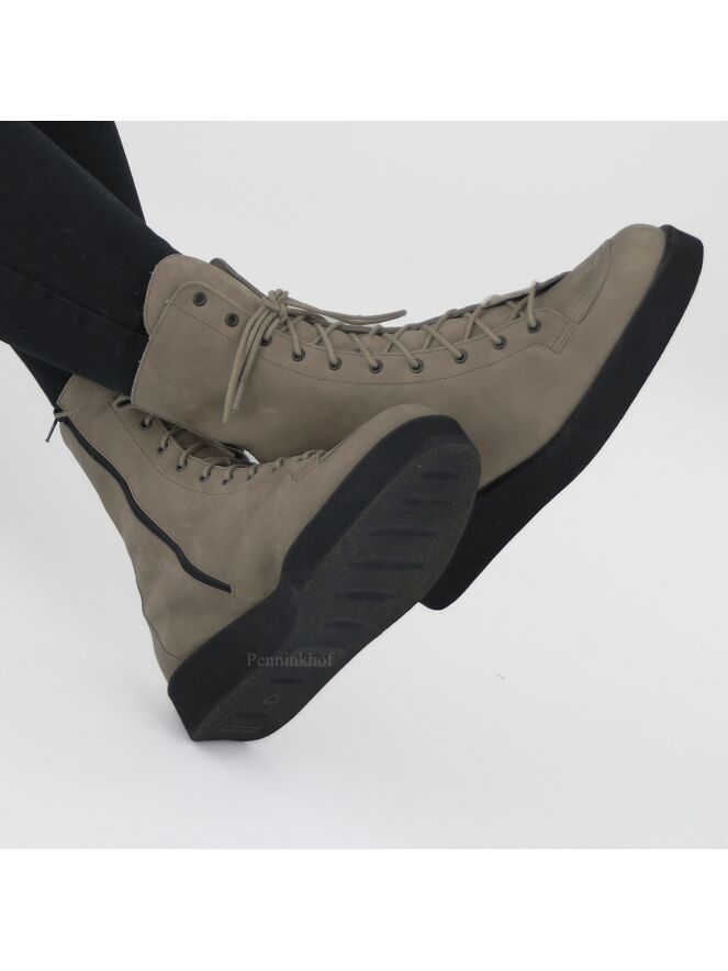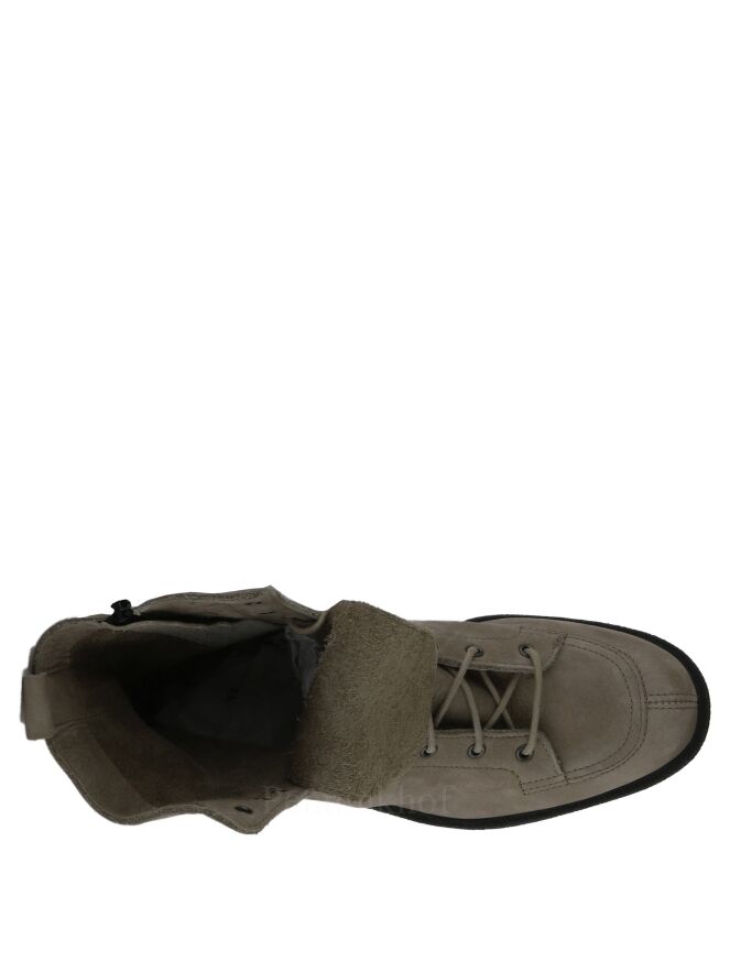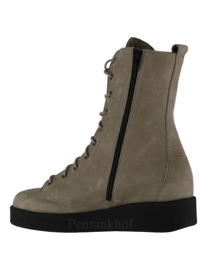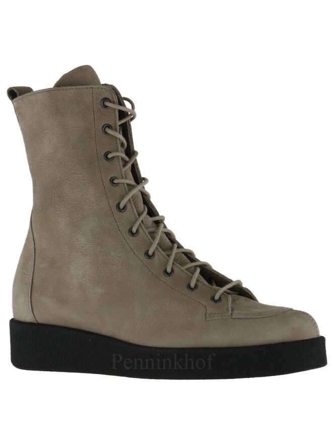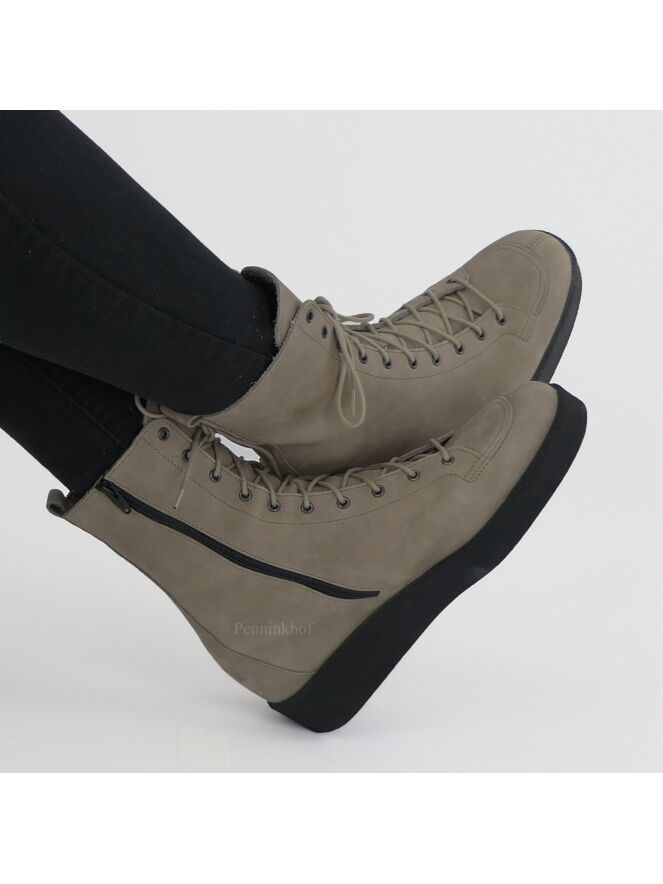 Een veterlaarsje van Arche in de kleur taupe. Aan de binnenzijde is een zwarte rits. De zool is in de kleur zwart en de binnenkant is ongevoerd.