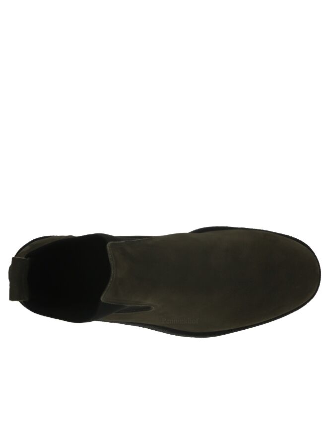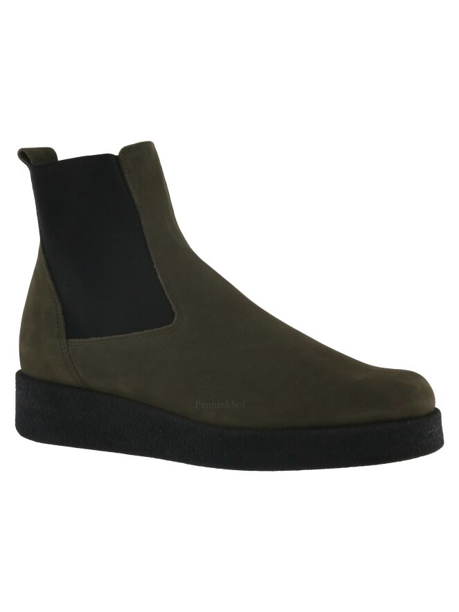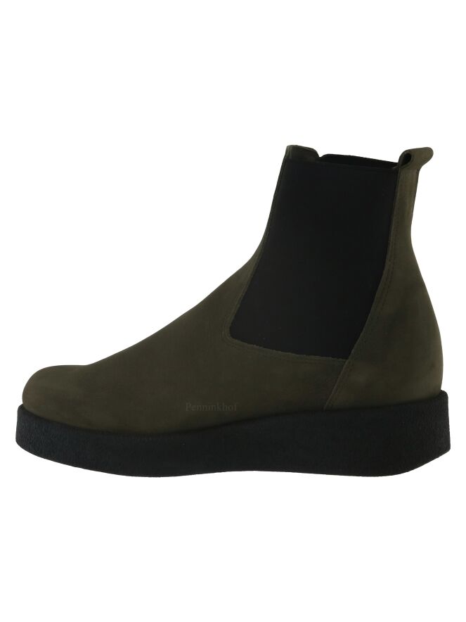 Een enkellaarsje van Arche in de kleur grijs. Het laarsje heeft een iets verhoogde sportieve latex zool in de kleur bruin. Aan beide kanten van de schacht is een zwart elastiek stuk stof. De binnenkant is ongevoerd.