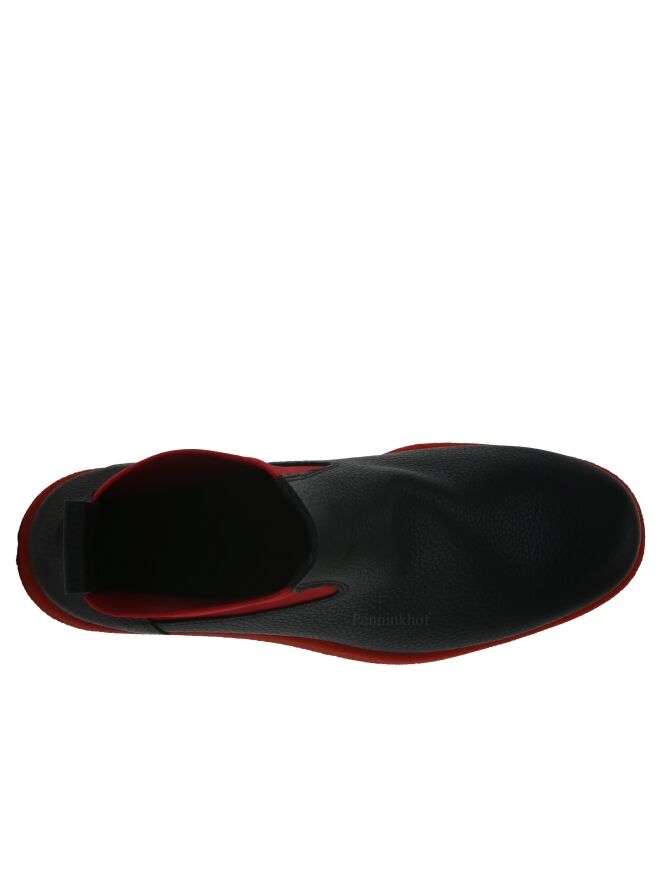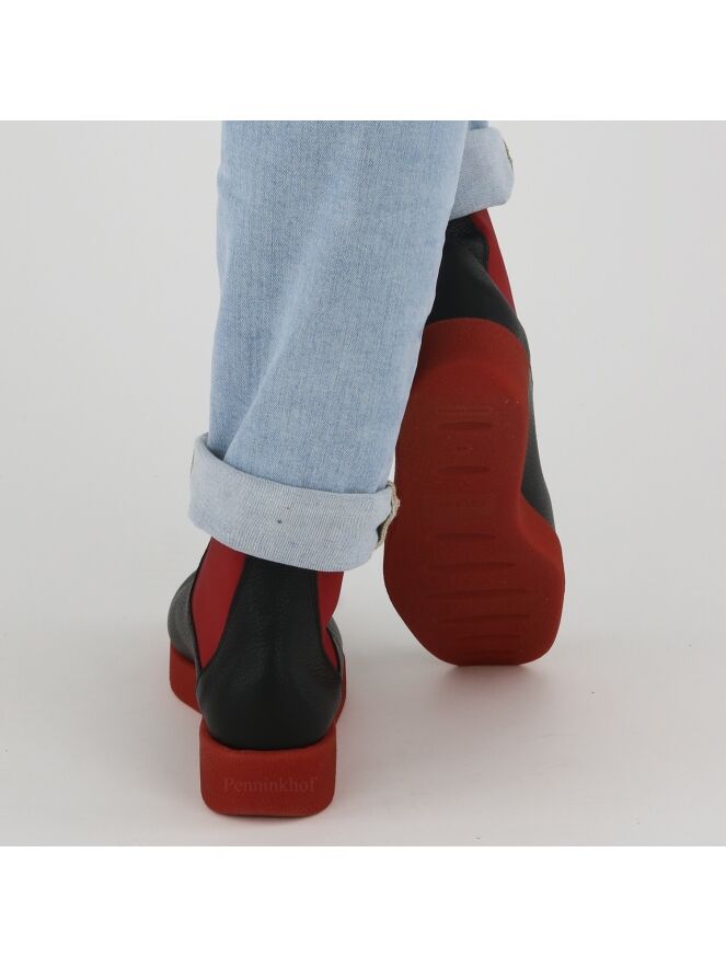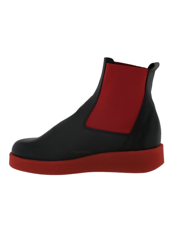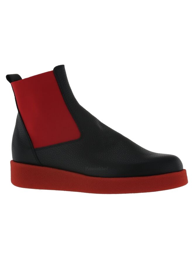 Een enkellaarsje van Arche in de kleur zwart. Het laarsje heeft een iets verhoogde sportieve latex zool in de kleur rood. Aan beide kanten van de schacht is een rood elastiek stuk stof. De binnenkant is ongevoerd.