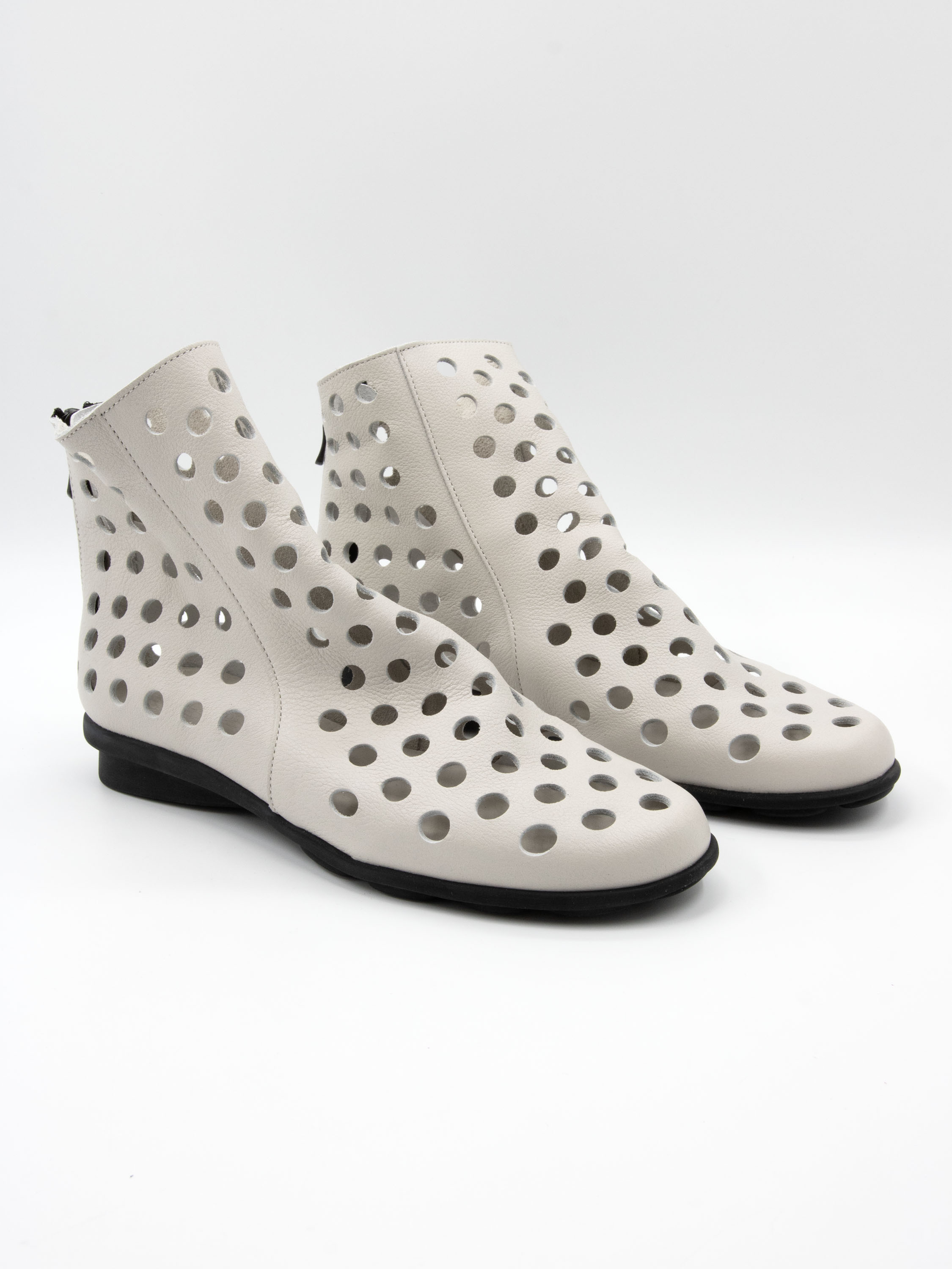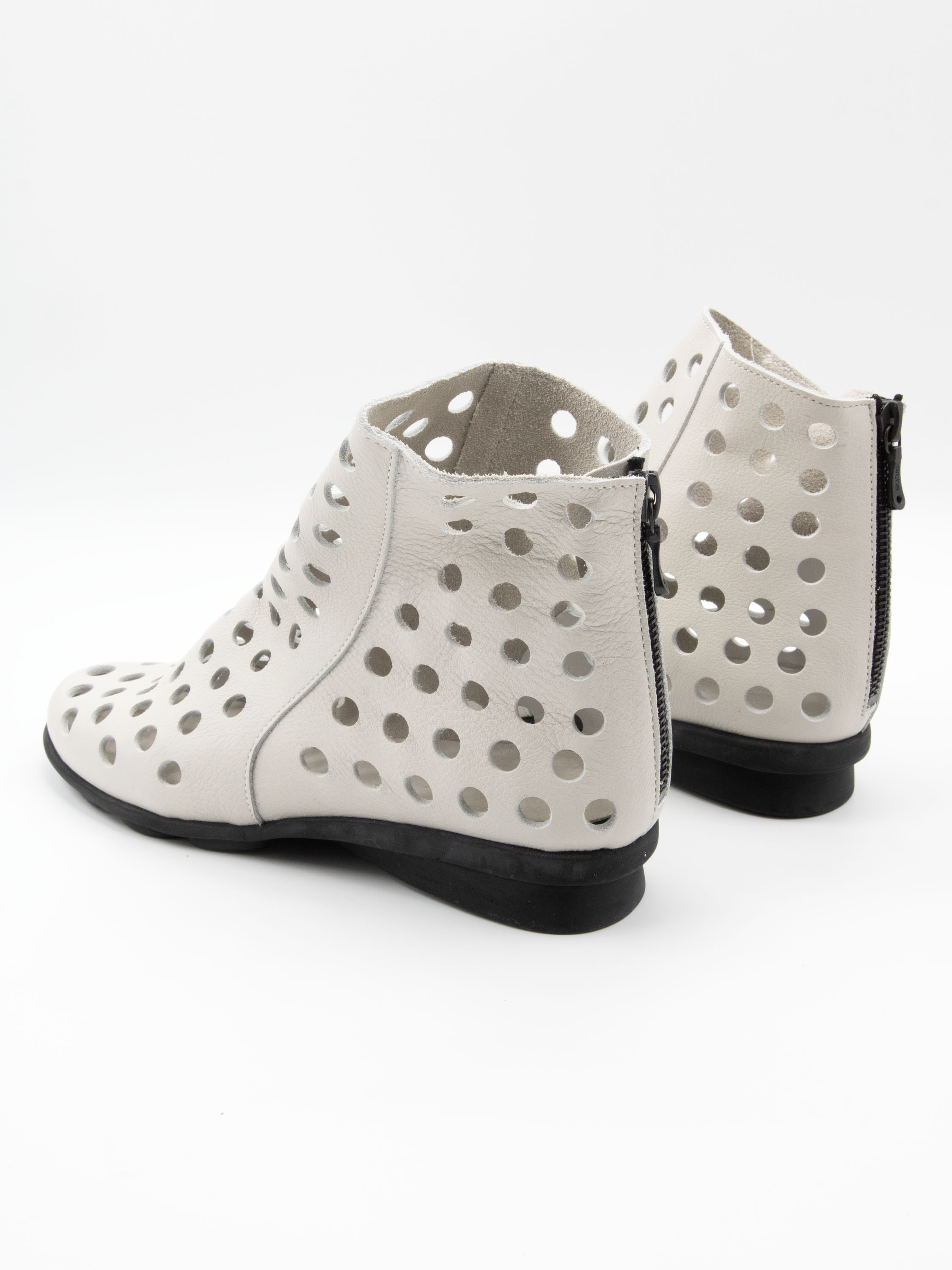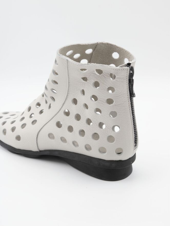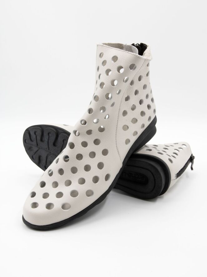 Kort geperforeerd instaplaarsje van Arche in een krijtwitte tint. Het soepele leder voelt uitzonderlijk zacht aan en zorgt voor een comfortabele pasvorm. Aan de achterzijde is een subtiel ritsje verwerkt voor extra gemak bij het aan- en uittrekken. De zwarte latex zool biedt lichtheid en flexibiliteit, terwijl de binnenzijde ongevoerd is voor een natuurlijke en ademende draagervaring.