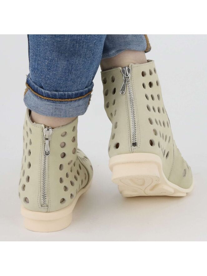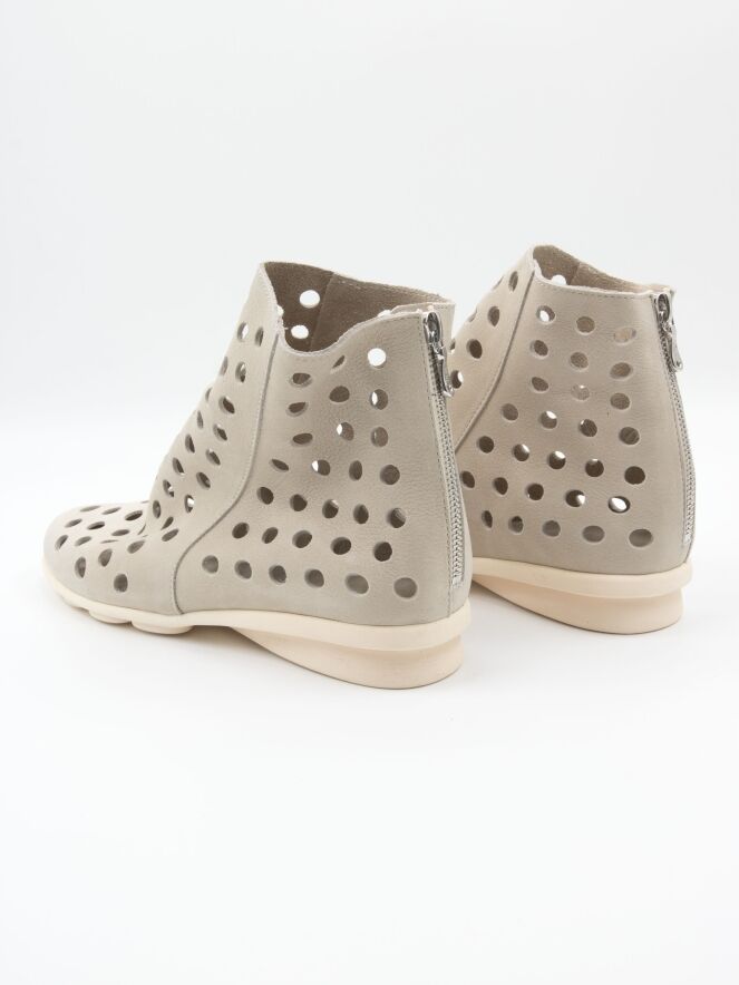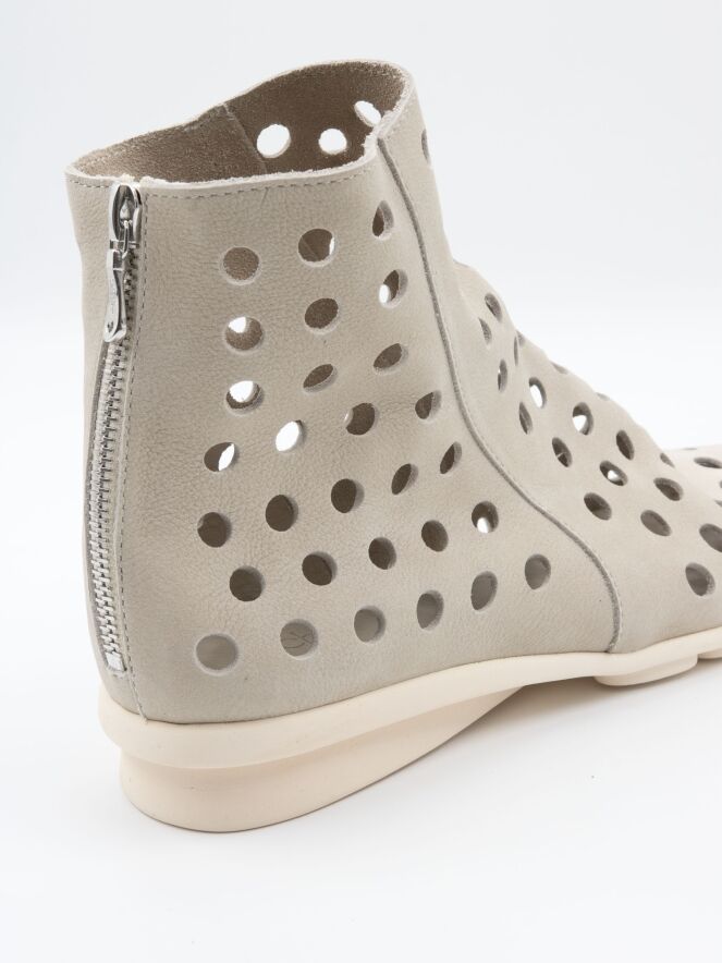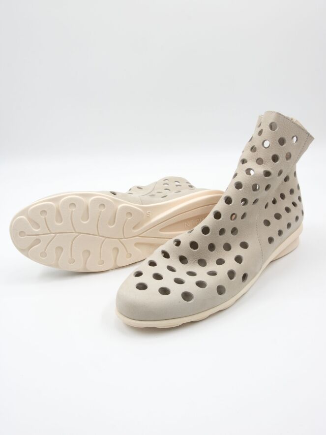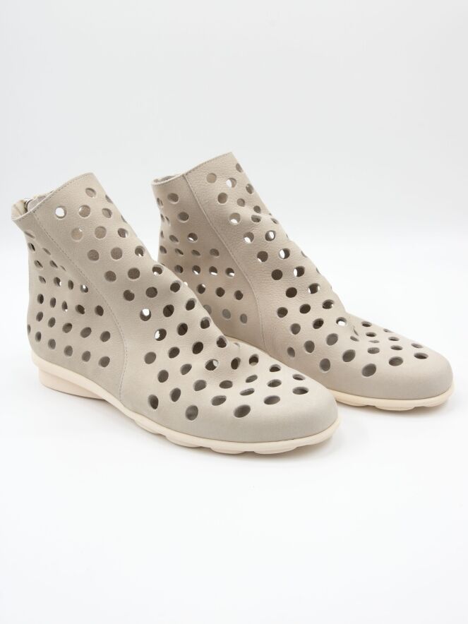 Een kort geperforeerd instap laarsje van Arche in een roomwitte kleur. Het leder is zeer soepel en aan de achterzijde van het laarsje is een ritsje ingezet. De zool is van latex in een witte kleur en de binnenzijde is niet gevoerd.