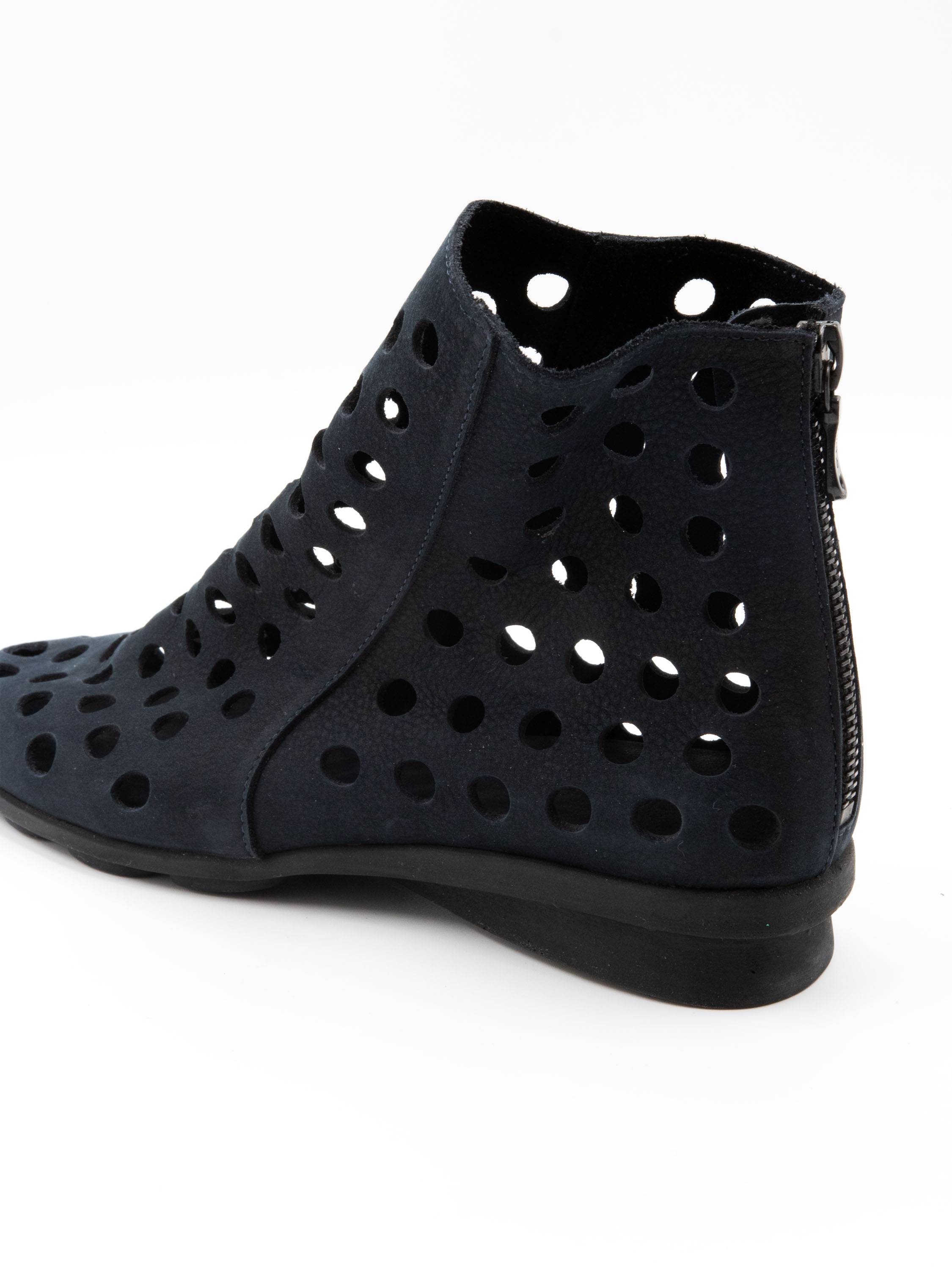 Kort geperforeerd instaplaarsje van Arche in een elegante marineblauwe tint. Het zeer soepele leder zorgt voor een uitzonderlijk draagcomfort. Aan de achterzijde is een ritsje verwerkt voor extra gemak bij het aantrekken. De zwarte latex zool biedt flexibiliteit en demping, terwijl de binnenzijde ongevoerd is voor een lichte en natuurlijke pasvorm.