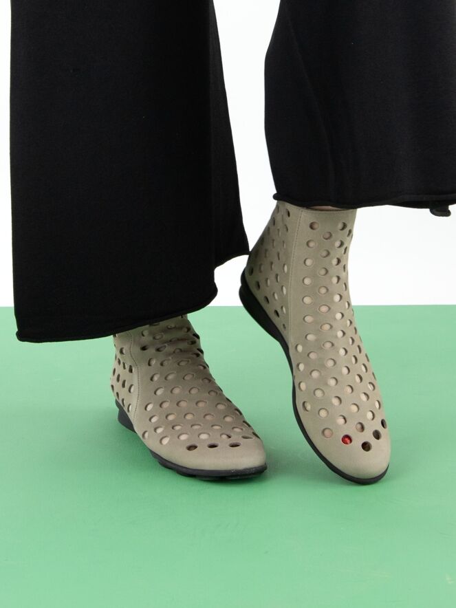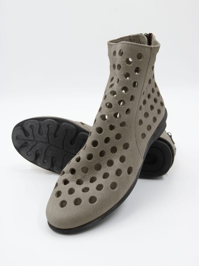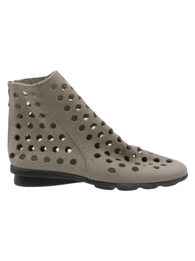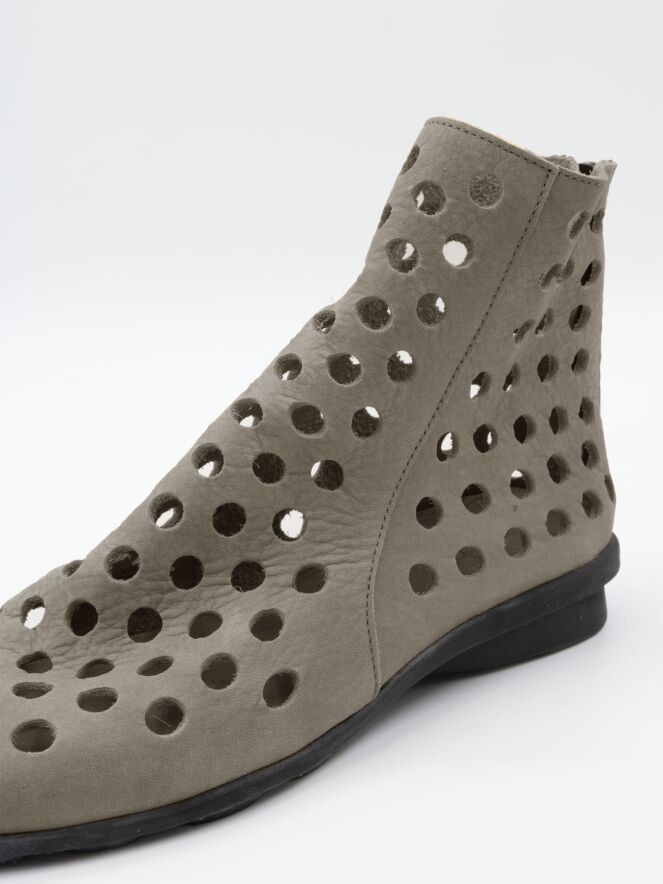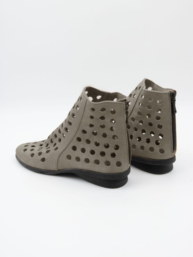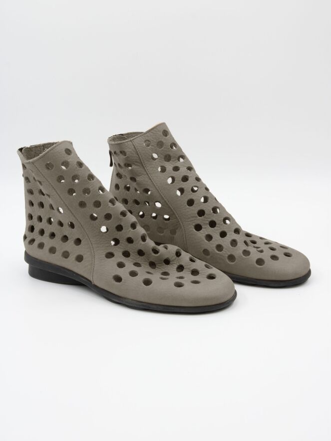 Een kort geperforeerd instaplaarsje van Arche in de kleur grijs. Het leder is zeer soepel en aan de achterzijde van het laarsje is een ritsje ingezet. De zool is van latex in een zwarte kleur en de binnenzijde is niet gevoerd, wat zorgt voor extra flexibiliteit en comfort.