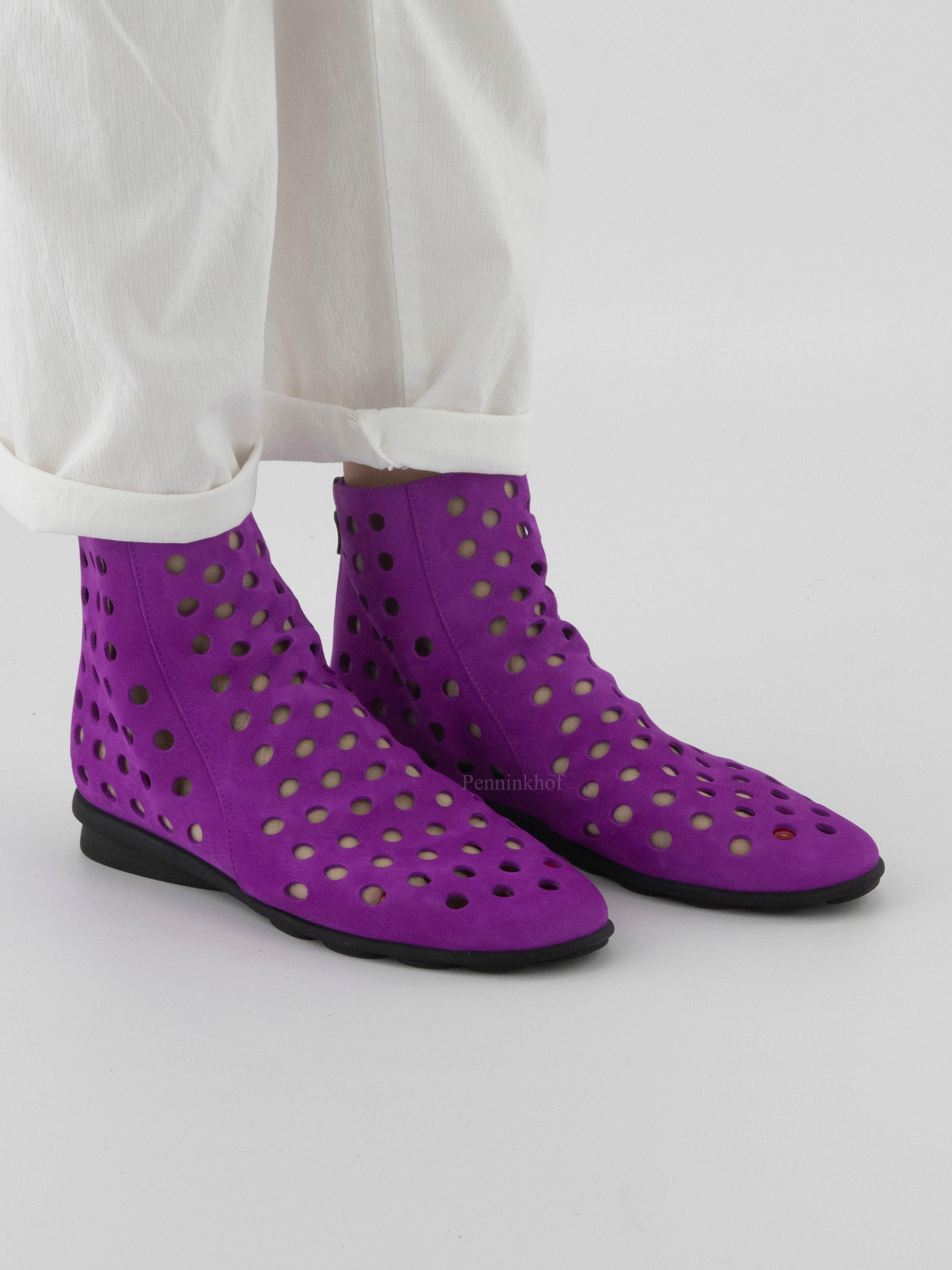 Een kort geperforeerd instap laarsje van Arche in een paarse kleur. Het suède is zeer soepel en aan de achterzijde van het laarsje is een ritsje ingezet. De zool is van latex in een zwarte kleur en de binnenzijde is niet gevoerd.