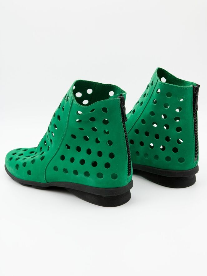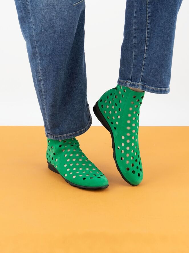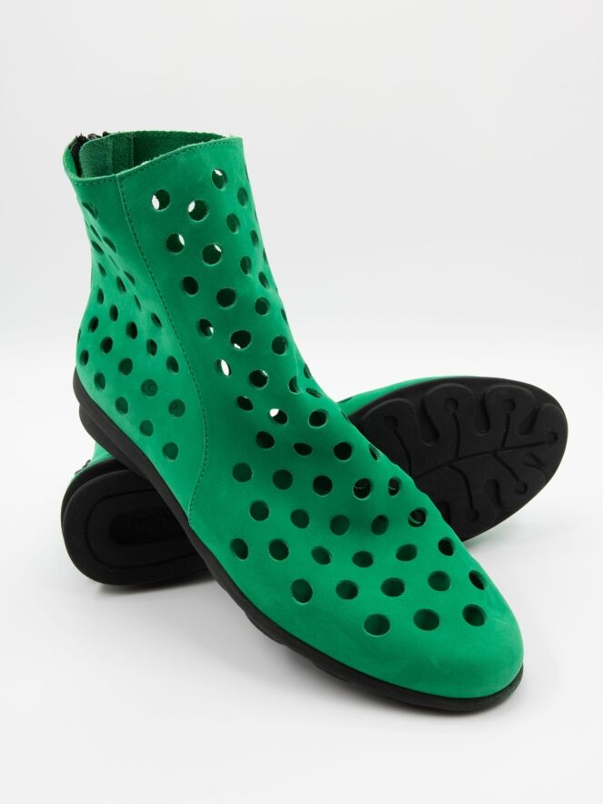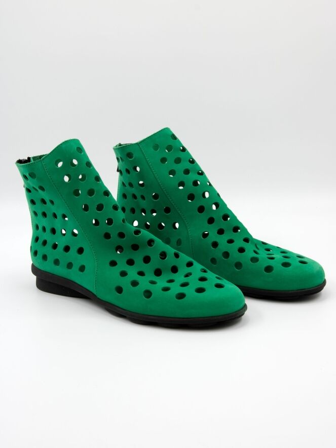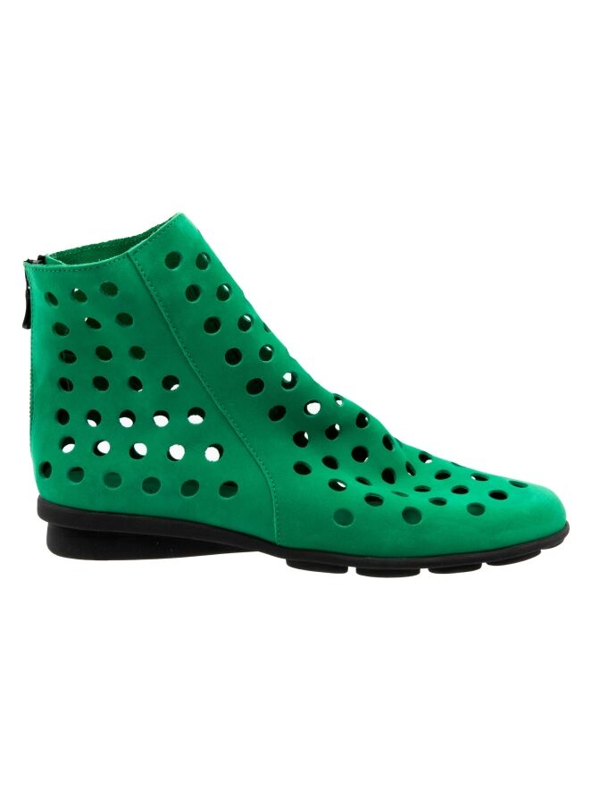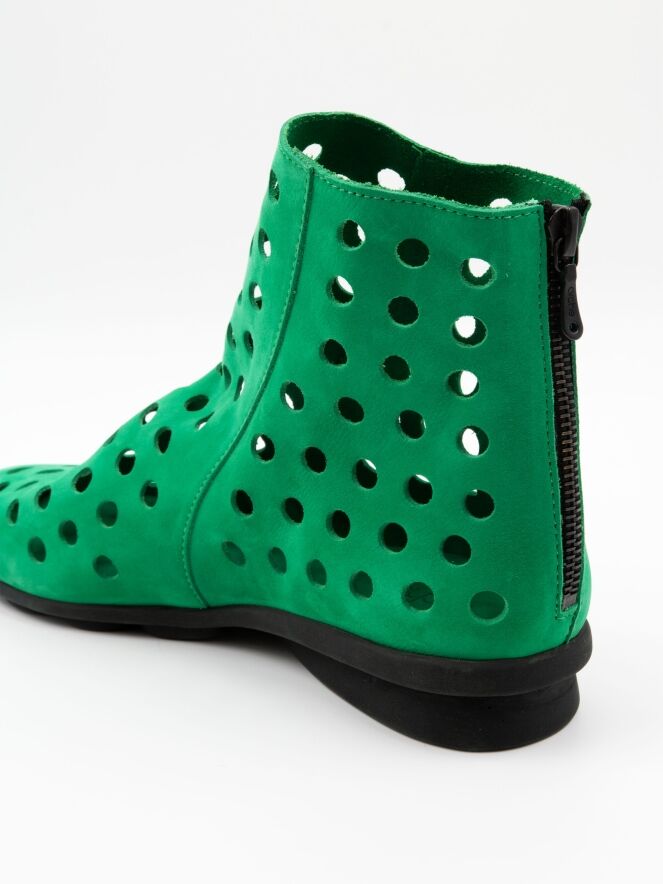 Een kort geperforeerd instaplaarsje van Arche in een smaragdgroene kleur. Het nubuck suède is zeer soepel en aan de achterzijde van het laarsje is een ritsje ingezet. De zool is van latex in een zwarte kleur en de binnenzijde is niet gevoerd, wat zorgt voor extra flexibiliteit en comfort.