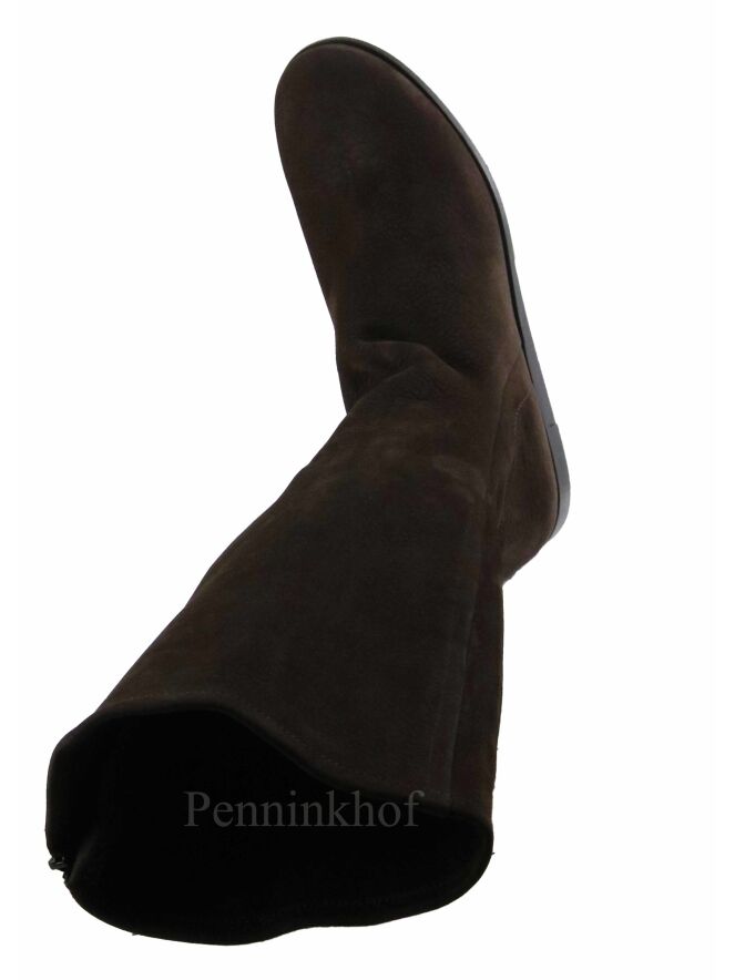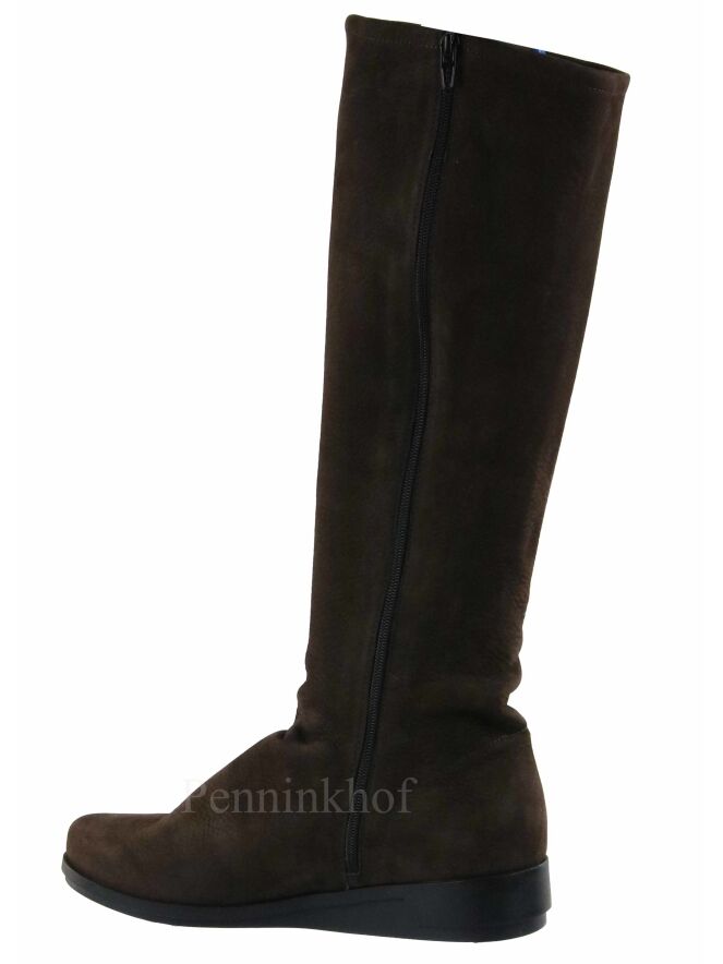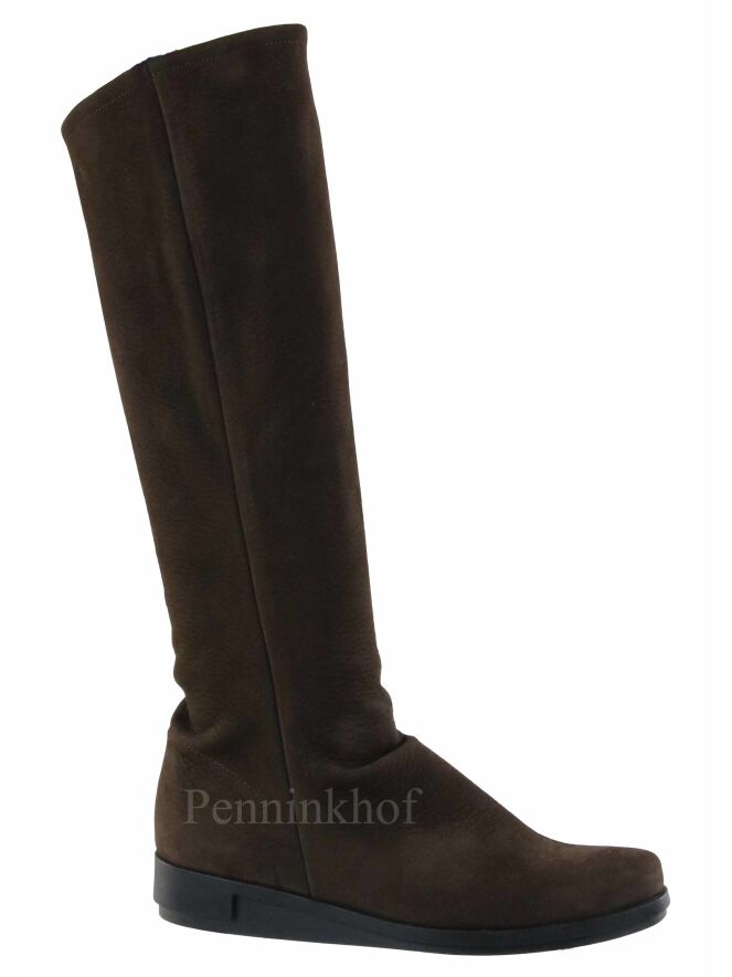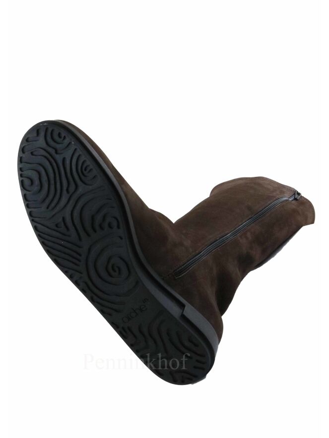 Een laars van Arche in de kleur mokkabruin. De zwarte zool is licht verhoogd. Aan de binnenzijde is een zwarte rits. De laars heeft een ronde neus en de binnenkant is ongevoerd.