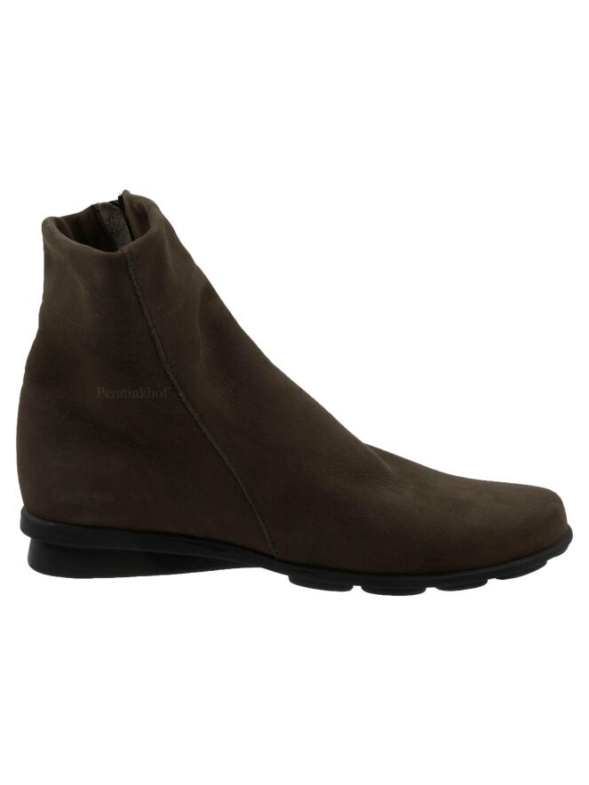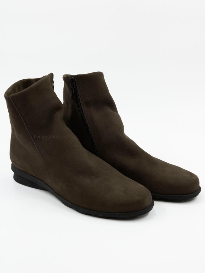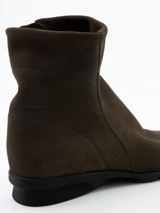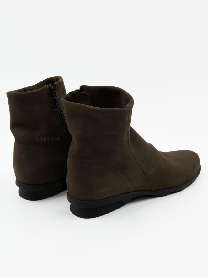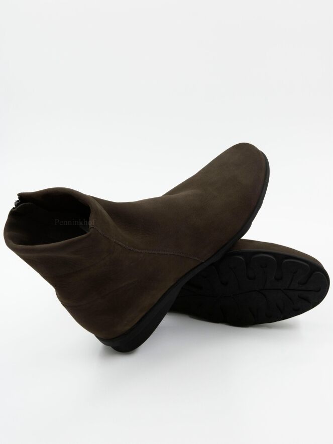 Een kort laarsje in de kleur mokkabruin. Het laarsje heeft een ronde neus en aan de binnenzijde van de schacht is een ritsje. De latex zool is bij de hiel iets verhoogd. De binnenkant is ongevoerd.