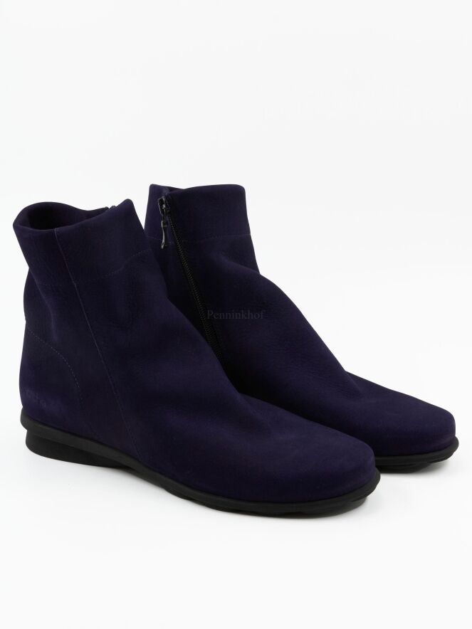 Een kort laarsje in de kleur paars. Het laarsje heeft een ronde neus en aan de binnenzijde van de schacht is een ritsje. De latex zool is bij de hiel iets verhoogd. De binnenkant is ongevoerd.