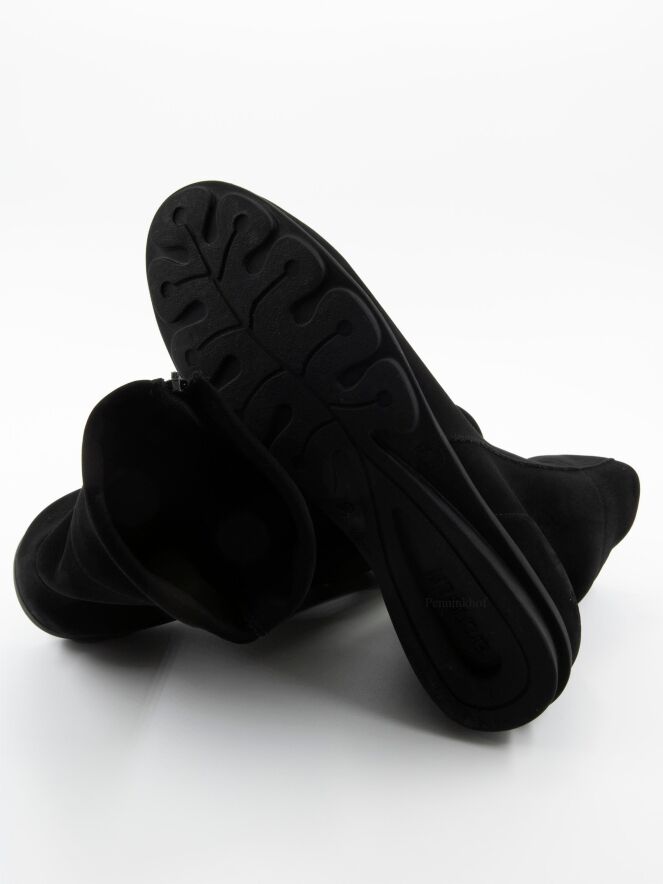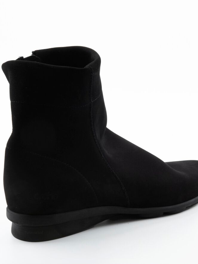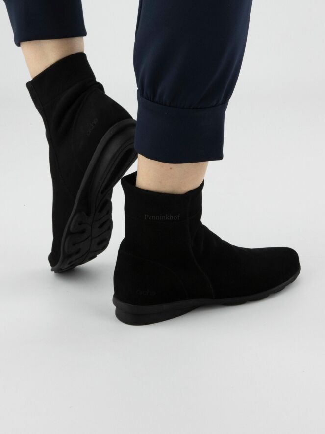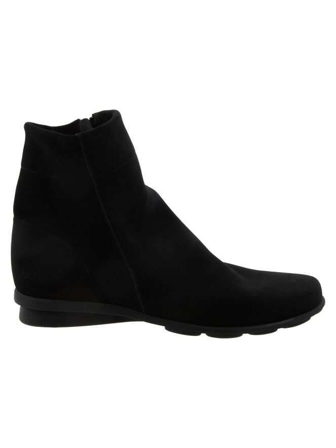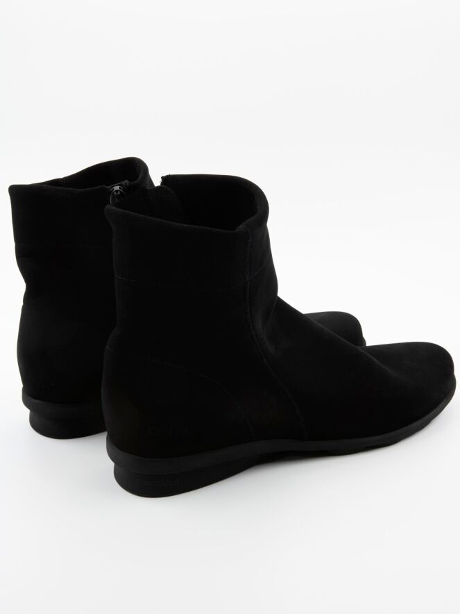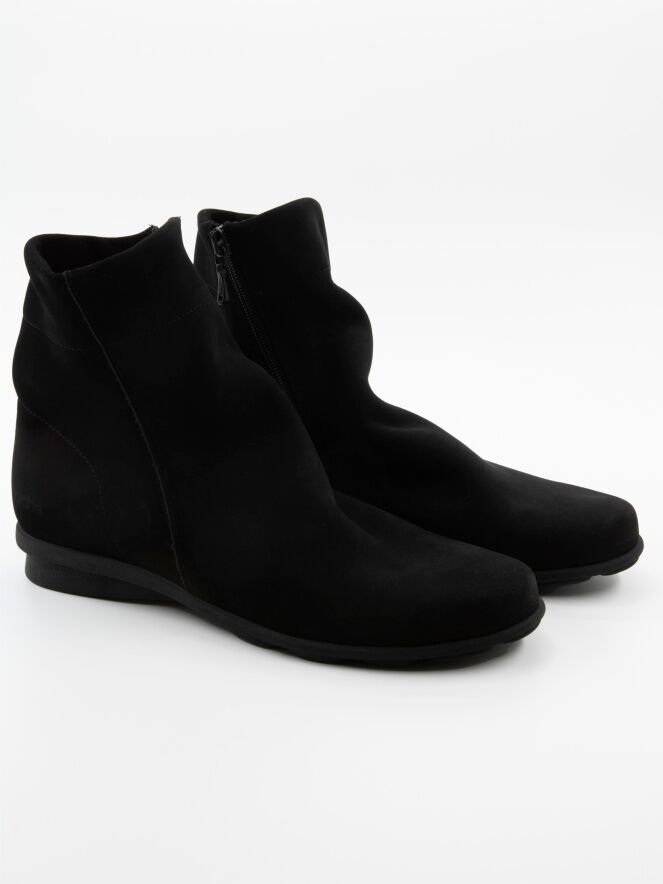 Een kort laarsje in de kleur zwart. Het laarsje heeft een rondeneus en aan de binnenzijde van de schacht is een ritsje. De latex zool is bij de hiel iets verhoogd. De binnenkant is ongevoerd.