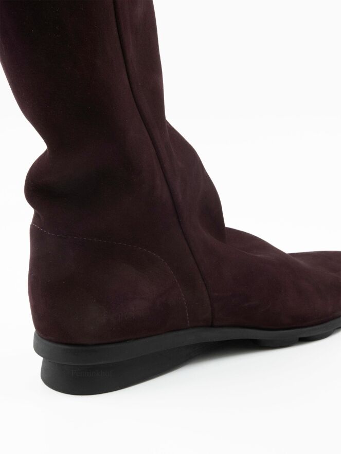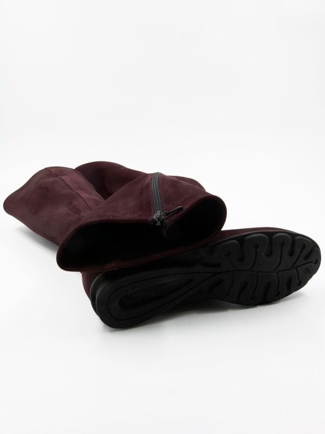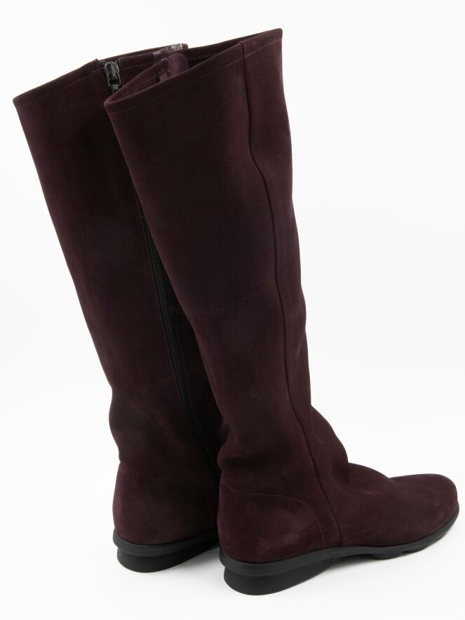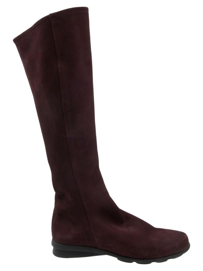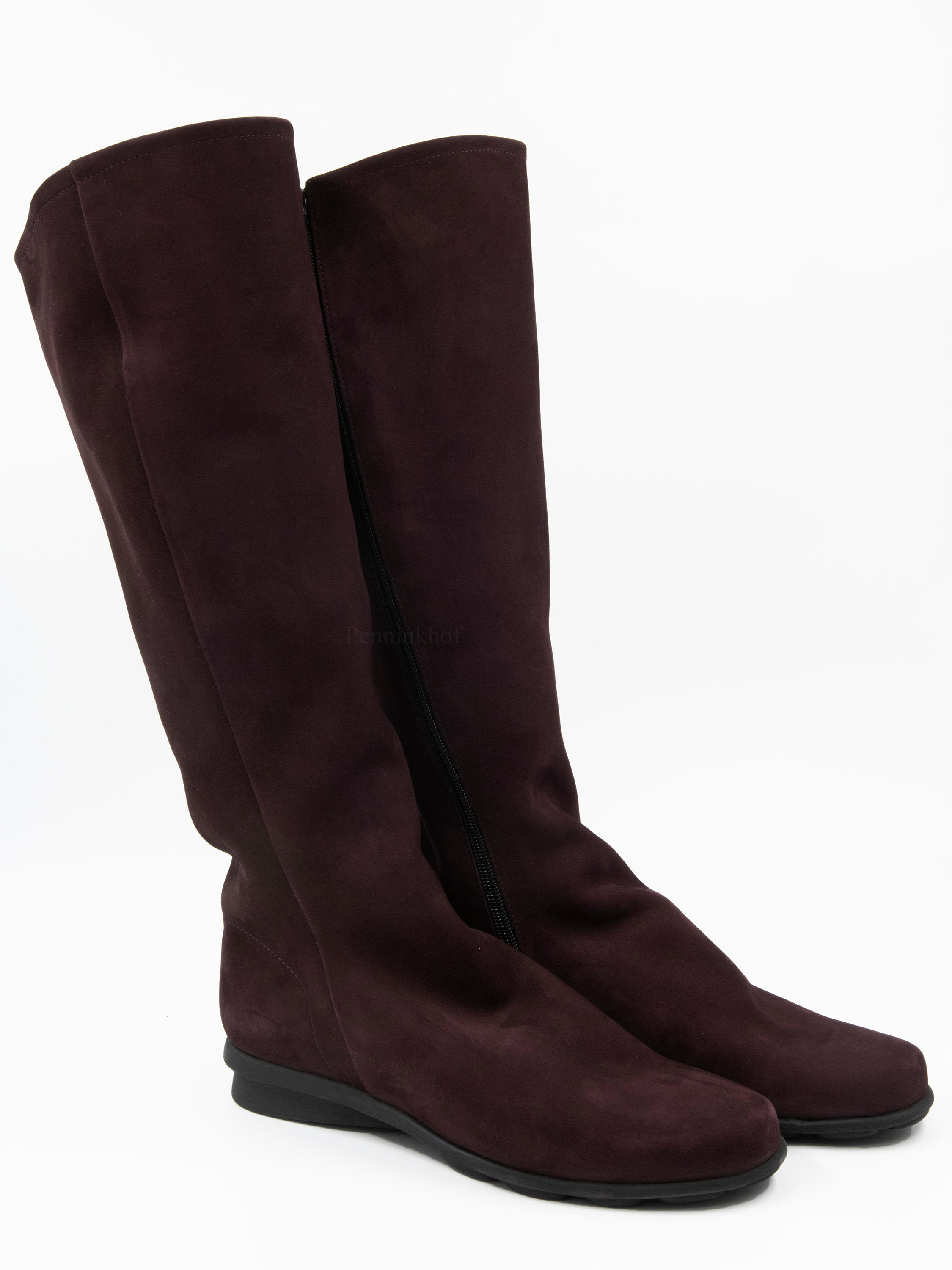 Een laars van Arche in de kleur bordeaux of pruimenrood. Aan de binnenzijde van de schacht is over de gehele lengte een zwarte rits. De binnenkant van de schacht is ongevoerd.
