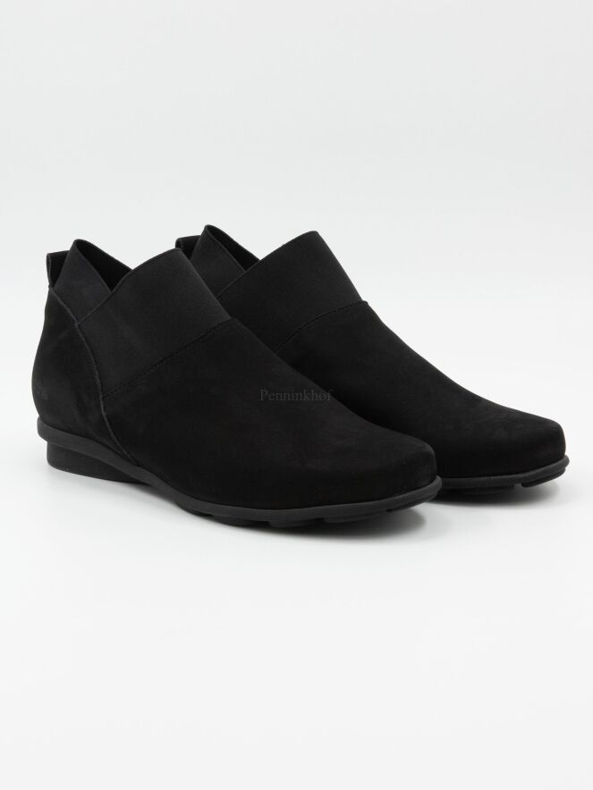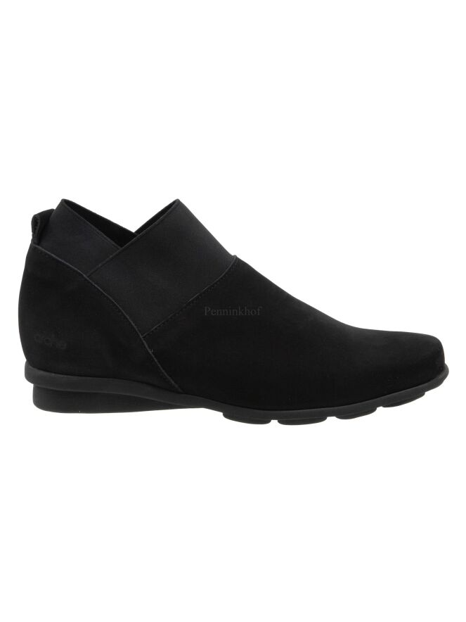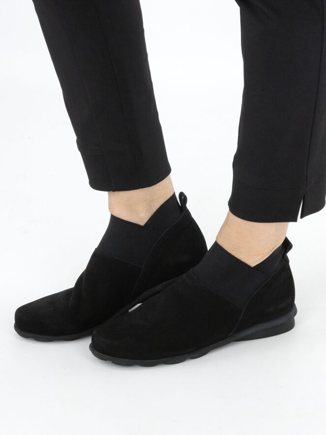 Een instapper in de kleur zwart met langs de rand van de schacht 2 elastische zwarte banden. De latex zool is onder de hiel iets verhoogd voor een beter comfort. De binnenkant is ongevoerd.