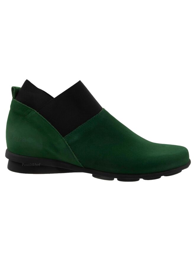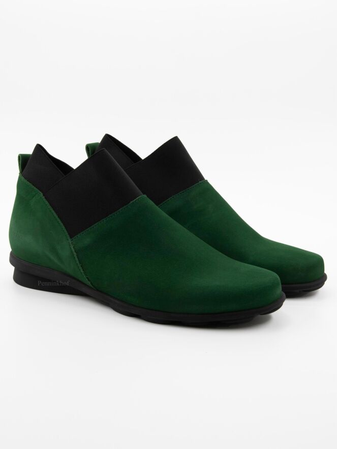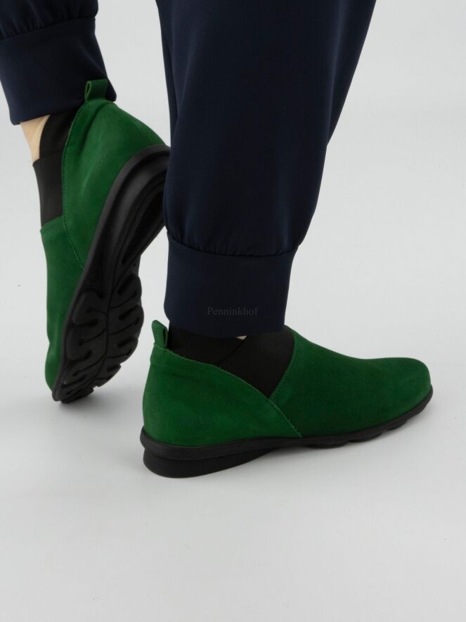 Een instapper in de kleur groen met langs de rand van de schacht 2 elastische zwarte banden. De latex zool is onder de hiel iets verhoogd voor een beter comfort. De binnenkant is ongevoerd.