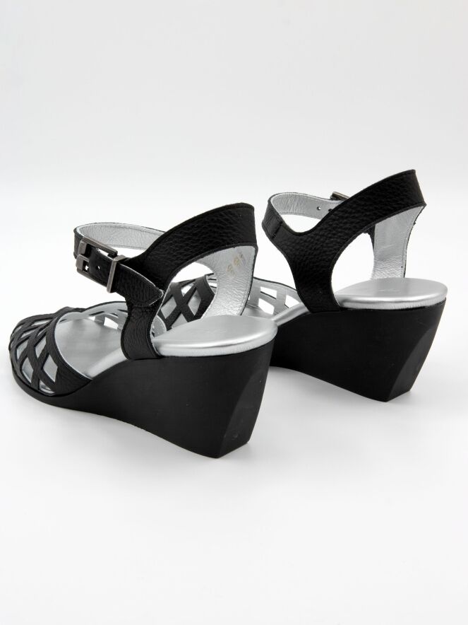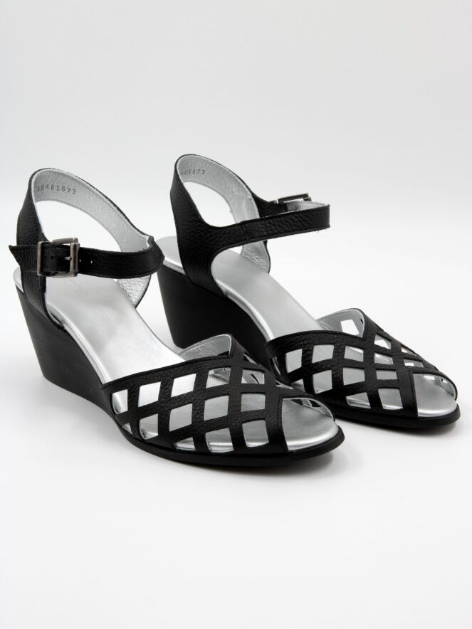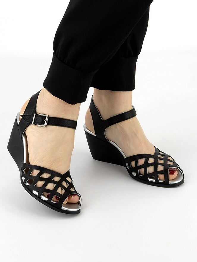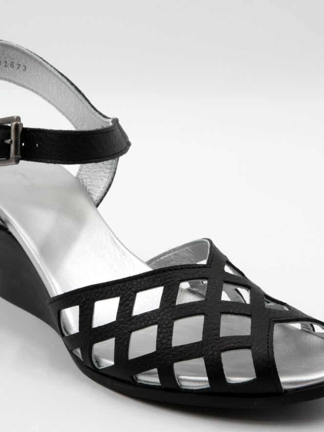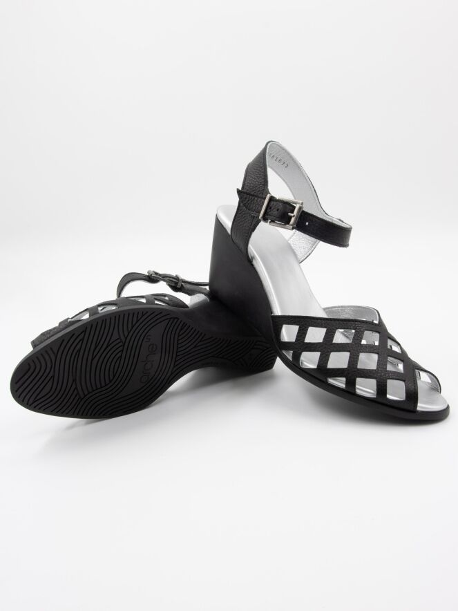 Een open pump van Arche in een zwarte kleur met over de voorvoet open leder in een ruitpatroon gesneden. Het voetbed is in een zilveren kleur. De pump heeft een open teen en een sleehak in de kleur zwart. Het enkelbandje is verstelbaar.